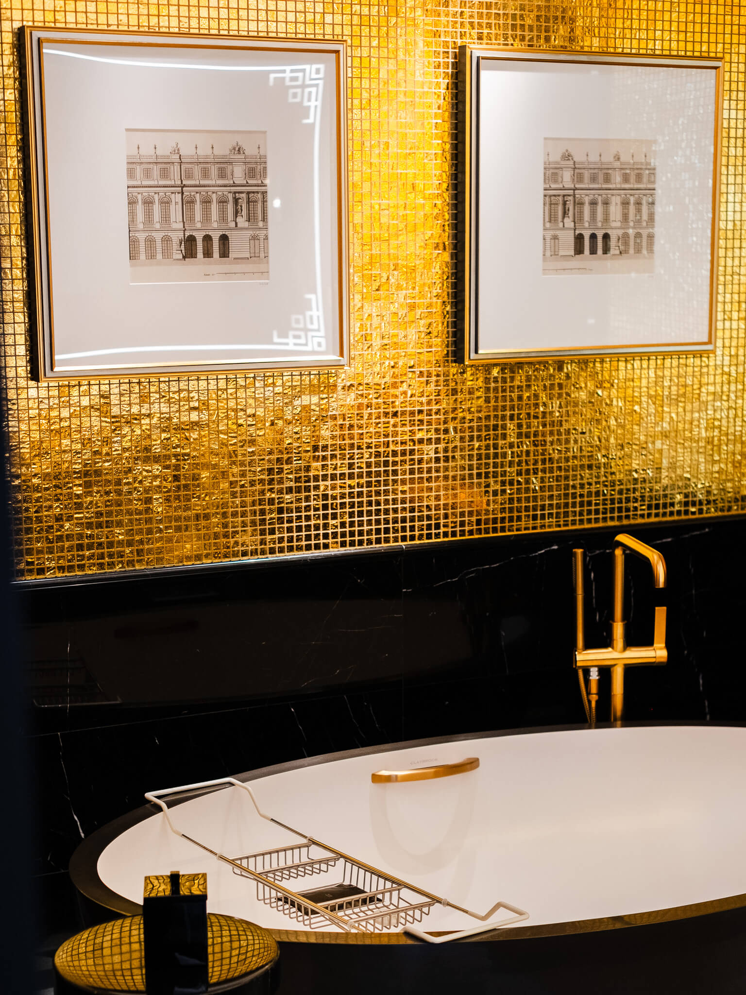 當你往飯店的深處走,整個房間內最令人震驚的,莫過於那大面積金色馬賽克鋪陳的浴室。