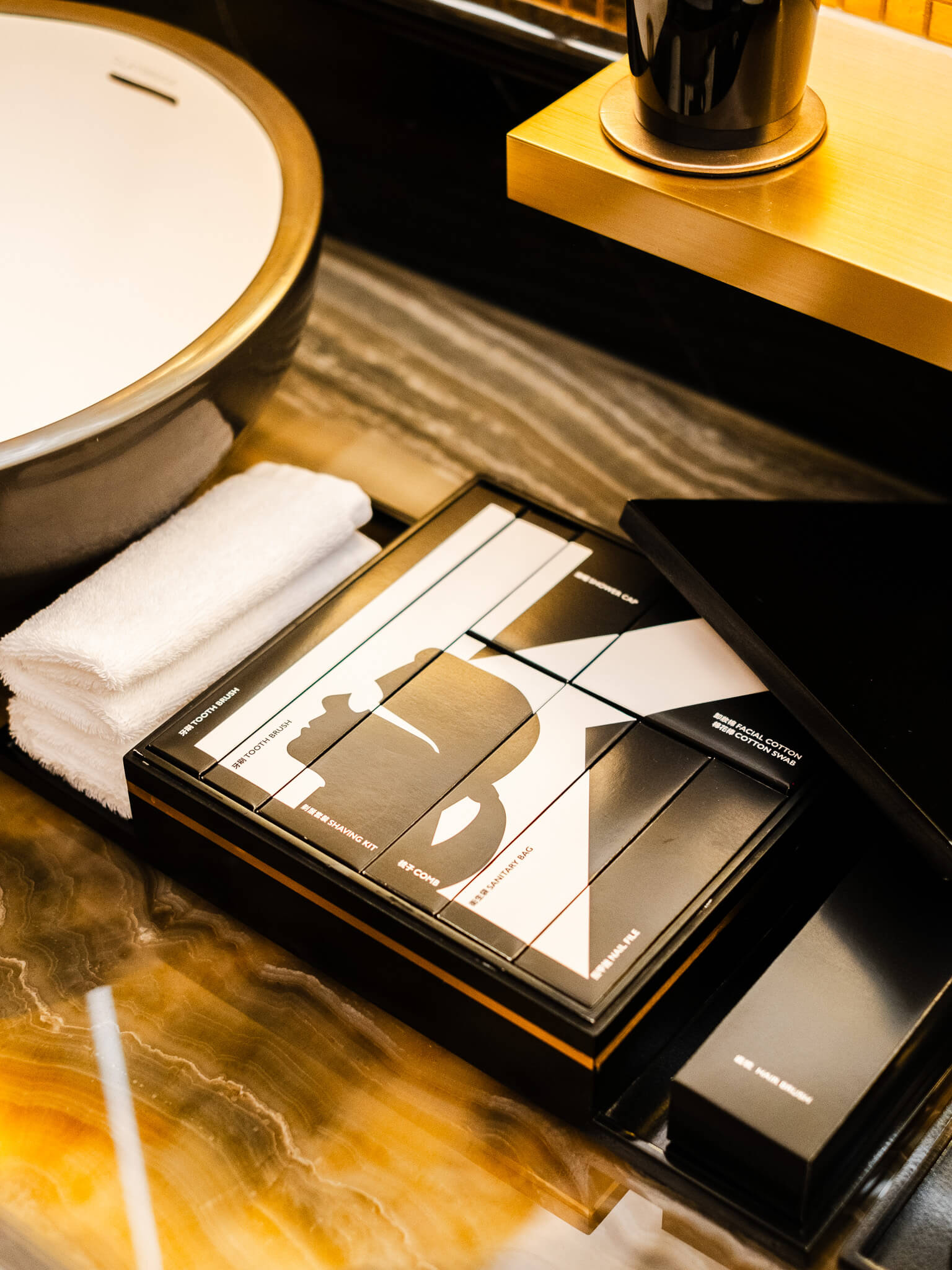 位於三樓的The Karl Lagerfeld水療中心捨棄了慣見的米白與原木,以黑金色為主調,黑色雲石與金色馬賽克相互輝映,糅合中西裝飾藝術元素,讓人一踏入便感受到一種與外界截然不同的時間感。中心內放置著一只直徑達2.1公尺的巨型玉石,精細的雕刻工藝在這個黑金空間裡自成一景。