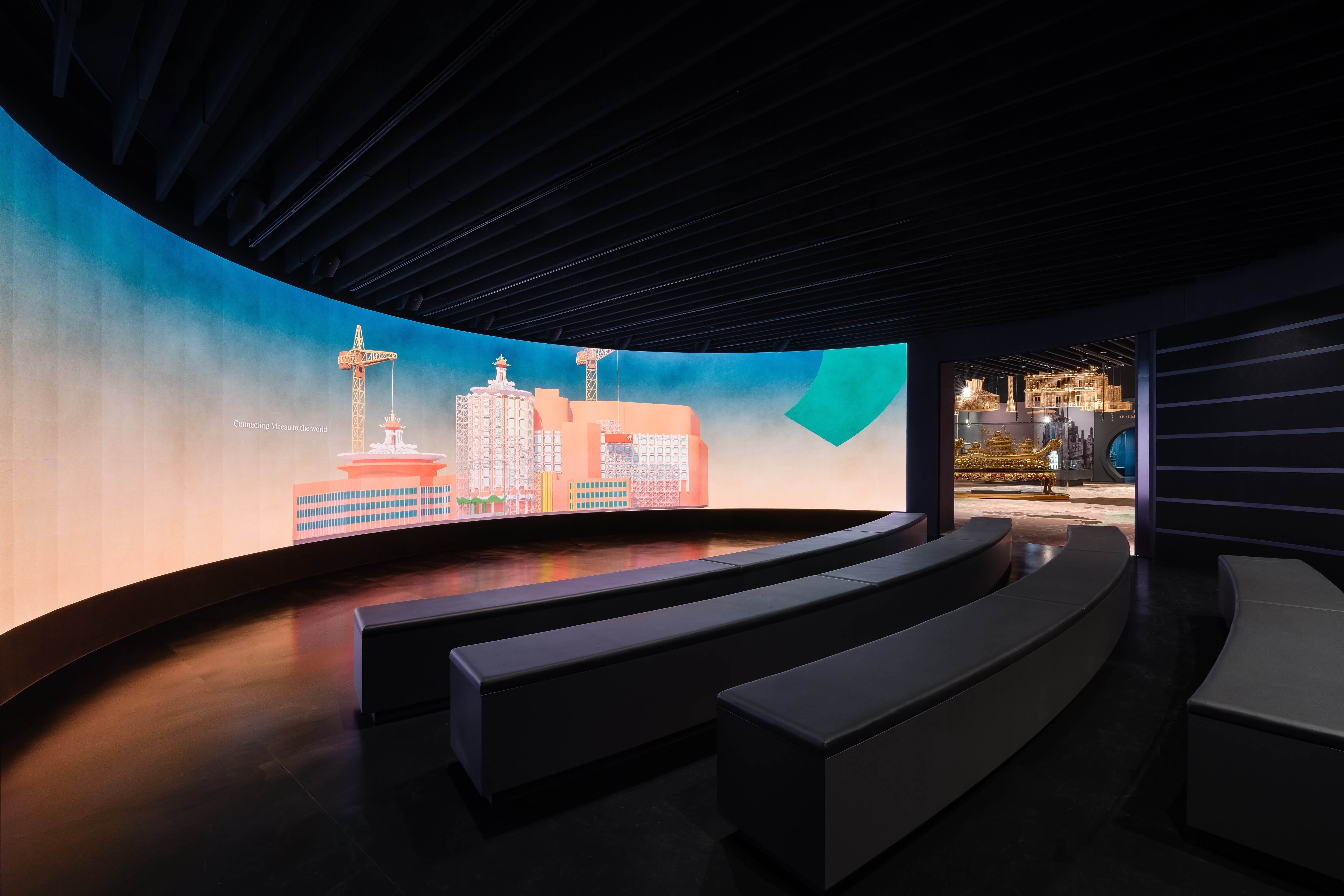 展覽以5分鐘的180度環幕影片揭開序幕。「龍」的意象貫穿始終,從明朝港口、葡萄牙商埠到回歸後的發展,巨大的光影將人包圍,彷彿搭上時光之船。當影像結束,一艘3.5公尺長的金箔木雕龍船迎面而來,融合航海文化、民俗信仰與歷史記憶,象徵澳門作為貿易樞紐的角色,也預告了接下來的旅程。
