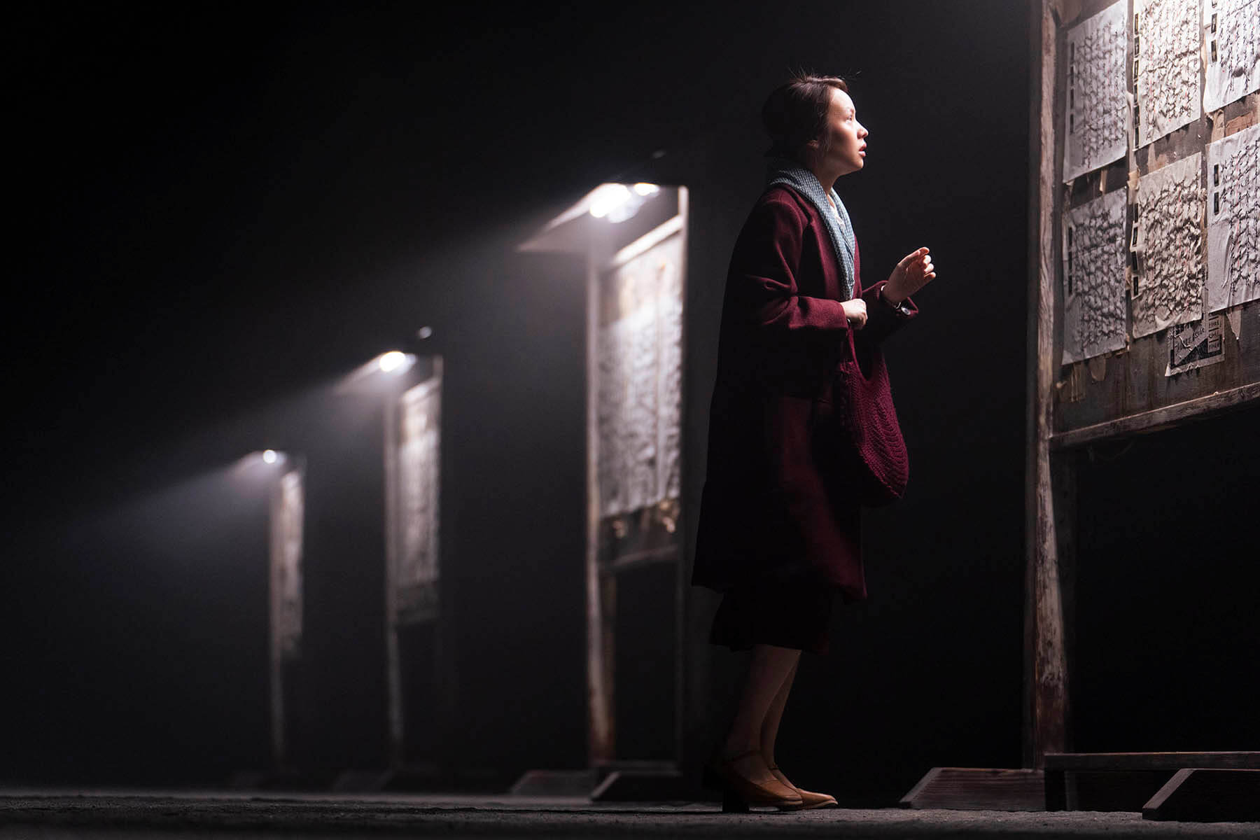 陳芯宜說的寫實,是讓觀眾與政治受難者一同置身於監牢當中,看他們消瘦的面容唱著〈安息歌〉,聽憲兵的步伐緩緩走來;而意象則是要被槍決的那一刻,眼前的人已被拖至遠方,觀眾身後則是他的妻子在佈告欄上尋求丈夫存活的渺茫希望,下方的兩個洞站滿受難者,對觀眾投以專注的目光。目光霎時讓觀眾從觀者成了被觀者,投射的是被述說的渴望?亦或是對被行刑者的目送?