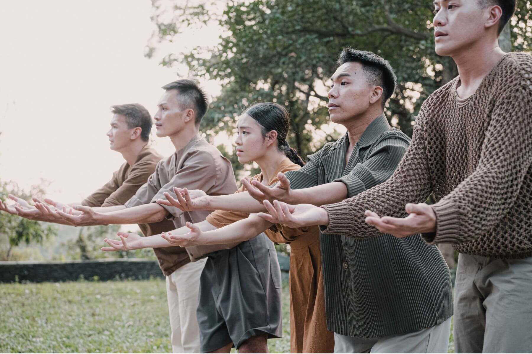 「光用講的你可能很難了解,我們做給你看。」路之、巴魯與舞者牽起手,開始「蒂摩爾身體技巧」的例行練習。古謠清亮的聲音從舞者的身體裡竄出來,在排練室裡震動,長成一株參天的古樹,隨著呼吸的風緩緩搖擺。接著眾人的和聲成為一片森林,有溪流從腳邊穿過,有樹葉捲上天空又隨之飄落,有動物濕潤的眼睛,炯炯地看向遠方深處。那是亙古的記憶,隨著共鳴來到這裡,沒有時間會流逝,只有呼吸起伏其中。輕快的呼吸、沉重的呼吸組成聲線,身體乘著聲線擺動,讓使用身體成為一件再自然不過的事。接著聲線簡化成呼吸,將律動化為元素、成為材料,讓身體帶著文化成為抵達當代的橋樑。