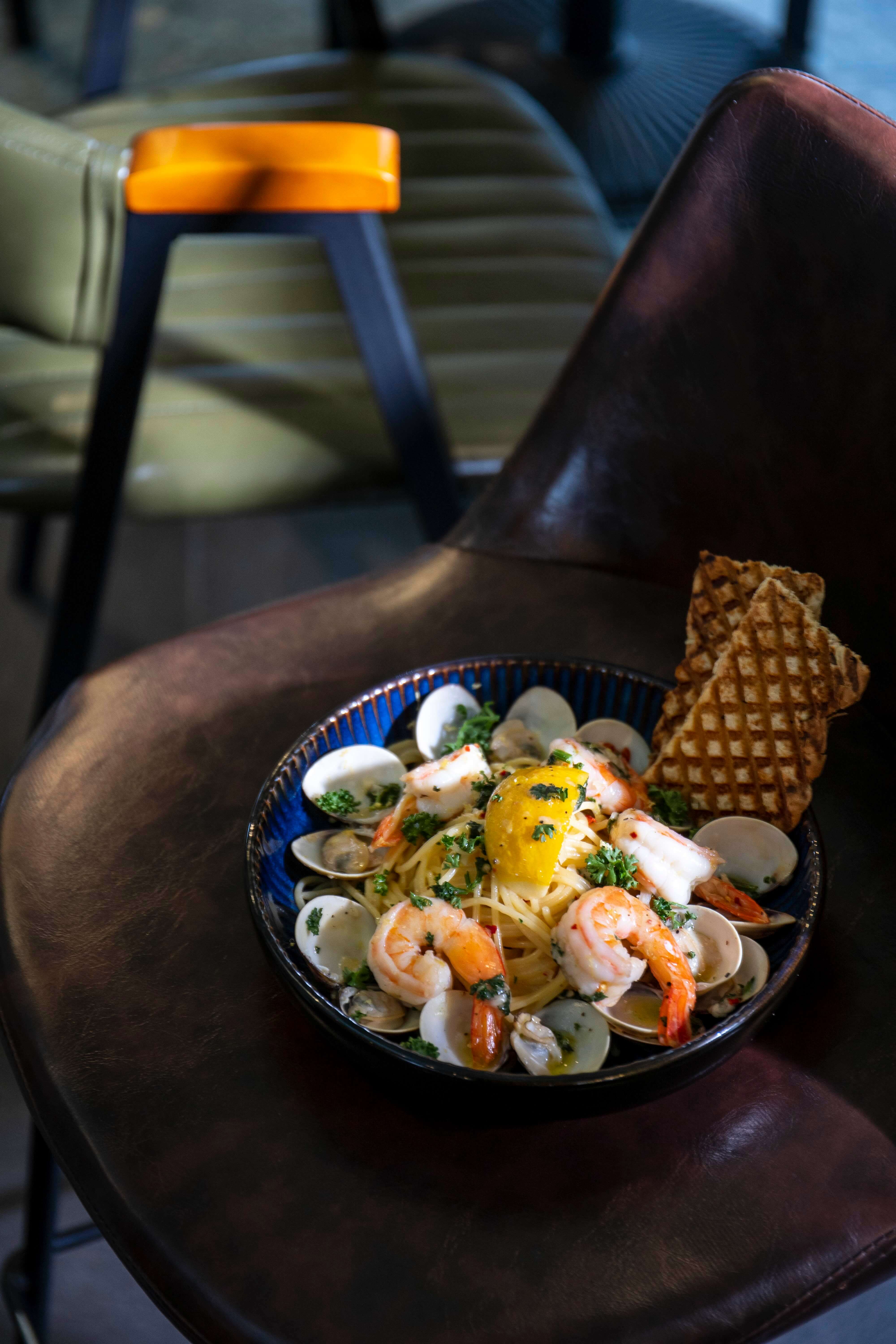 義大利麵組的必點招牌「鮮蝦蛤蠣雙鮮 (Melodia Del Mare)」雙重海鮮,加入羅馬諾羊乳起司搭配新鮮香草和巴西里,味道濃郁且層次豐富。「火烤章魚腳」(Pulpo A La Plancha)將章魚經過舒肥後煎烤又嫩又香,融合了台灣的地瓜泥和北非的哈里薩醬,是一道經典的料理。