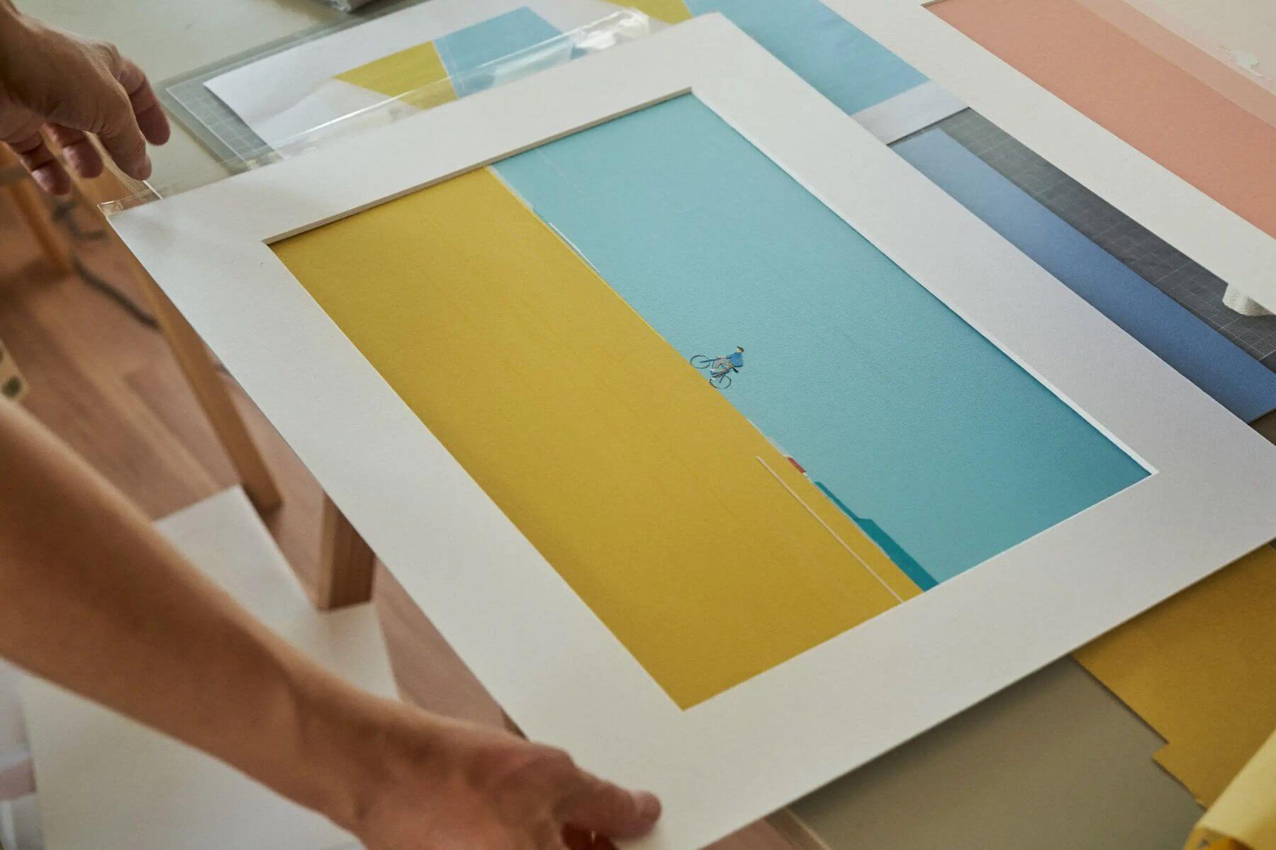 tokyobike與坂內拓的合作,交付給藝術家非常大的自由度與彈性。坂內拓表示:「在一開始的基調很快地確定下來後,我在一幅畫中會謹慎地考慮的是整體的平衡。」像是作品編號1「感受微風拂過臉龐」為本次的主視覺,坂內拓將藍色和黃色的紙疊在一起,就這樣得到了天空與地面的視線。「由於這次的主題是自行車,所以我想在畫面中加入騎著自行車的人,這樣感覺會更好。」接著,坂內拓根據多一些直覺來決定細節,去增加具體感,與自行車的速度感。