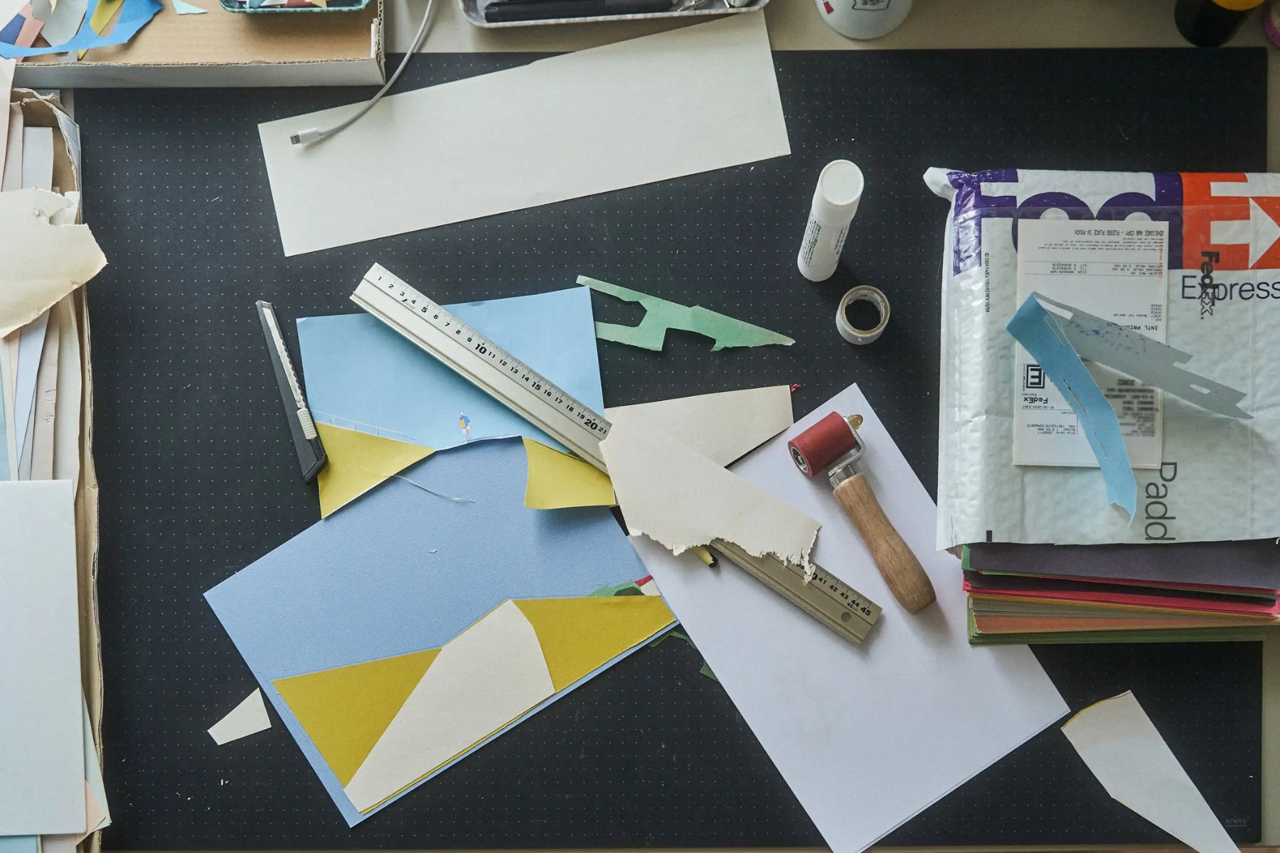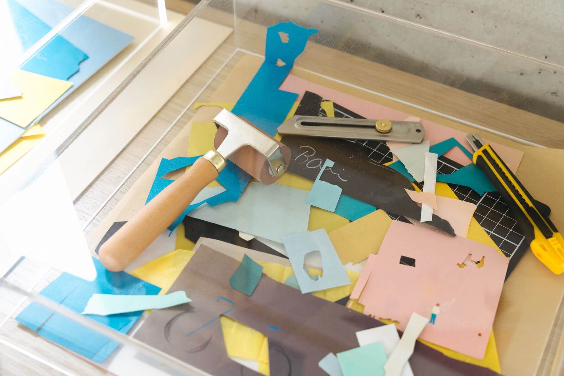 滾筒也是坂內先生非常喜歡的工具之一,它代表工作的最後步驟,像標記一樣,確定好位置、貼好,用滾筒在紙上面滾一下,就表示它確定下來不會再動了。