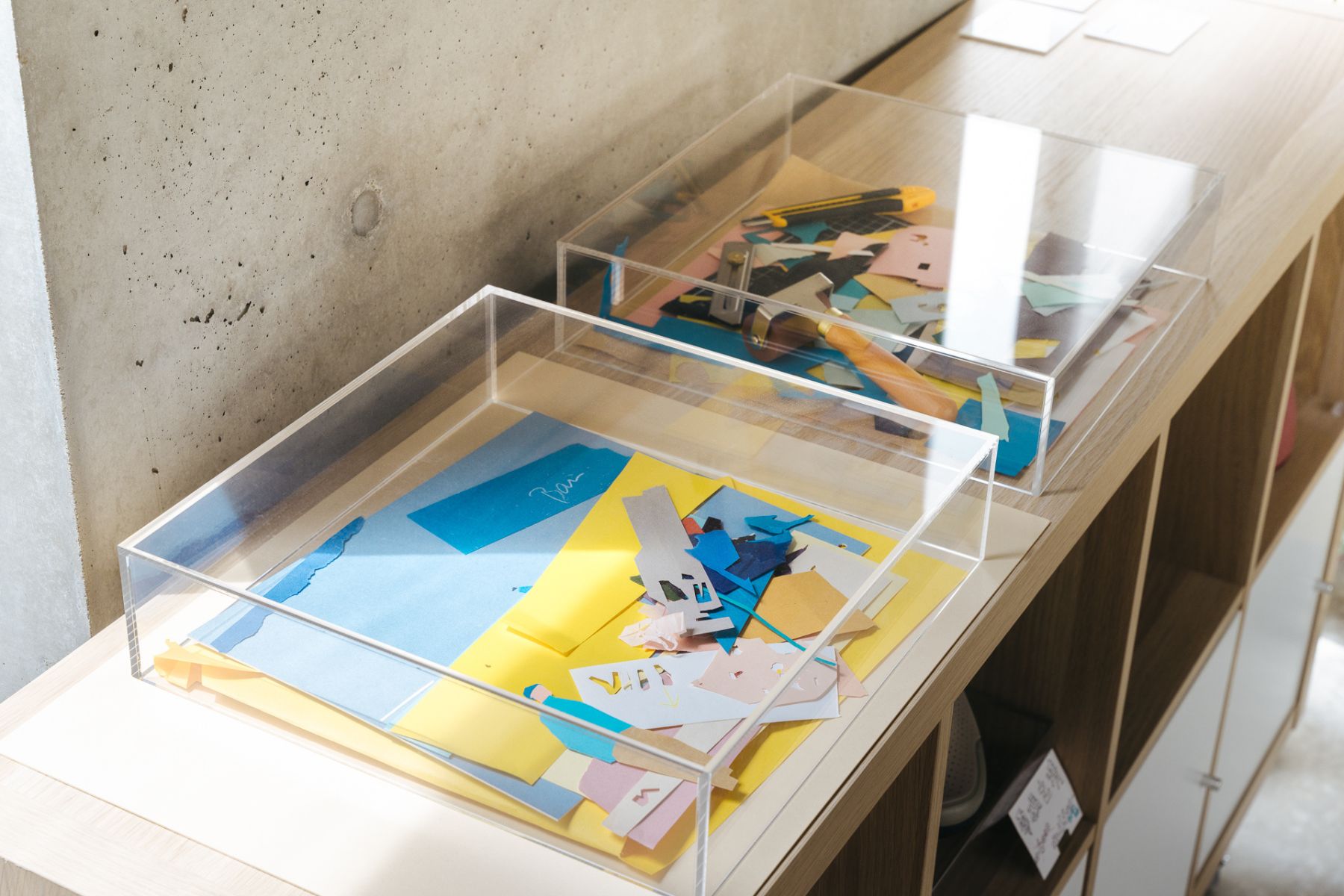 坂内先生表示:「創造出雕塑般的立體感非常重要。」他偏愛使用具有壓抑質感和多樣色彩的特銅紙,半透明的描圖紙,也在創造微妙的陰影和形狀等扮演重要的角色。紙雖然每張很薄,但通過疊加可以感受到深度,或者說世界觀的擴張。紙的厚度確實會影響到立體感,即使是薄紙,通過疊加就能創造出前後遠近。
