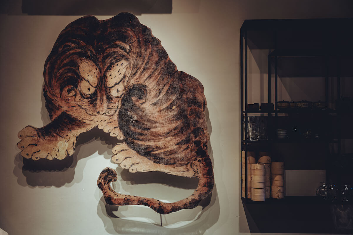 吧檯的壁面上裝飾了陳家收藏的老虎指畫的複製品。