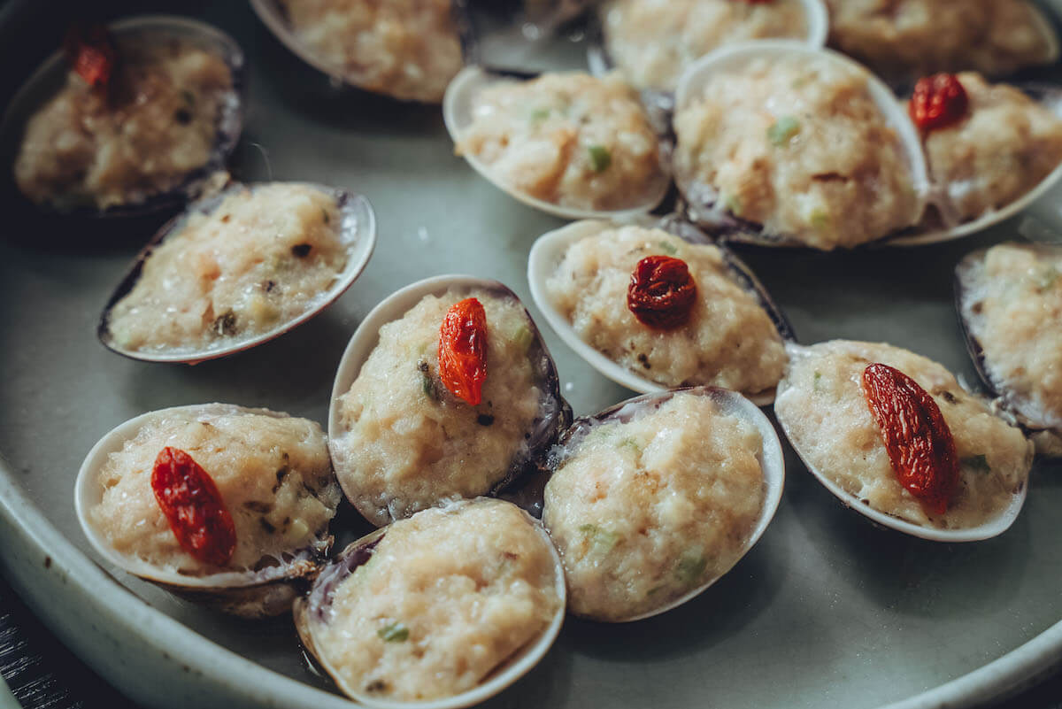 另一道「雙喜連」則是細剁的蛤蜊肉、絞肉與荸薺拌勻後回填蛤蜊殼蒸成,口感滑嫩間以清脆,蛤蜊與絞肉的汁水鮮甜滿口;其他還有糯米粥燉雞、獅子頭等料理。飯後推薦搭配陳家的私房小點「麥芽蒸蛋」,麥芽糖拌入蛋液十分費勁,是陳家男性製作限定的一道點心;「春捲」則是年節祭祀必備,象徵驚蟄後的春回大地。
