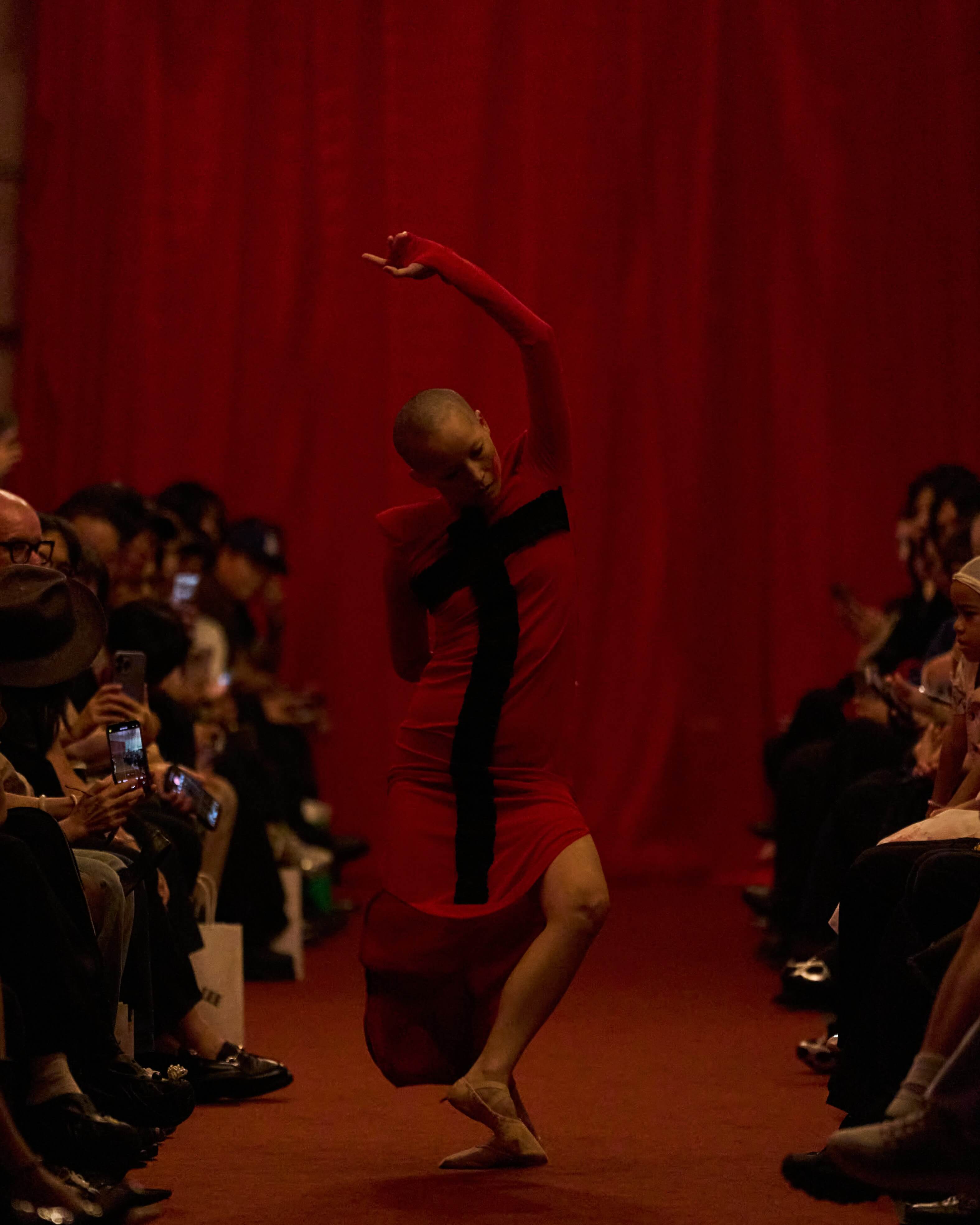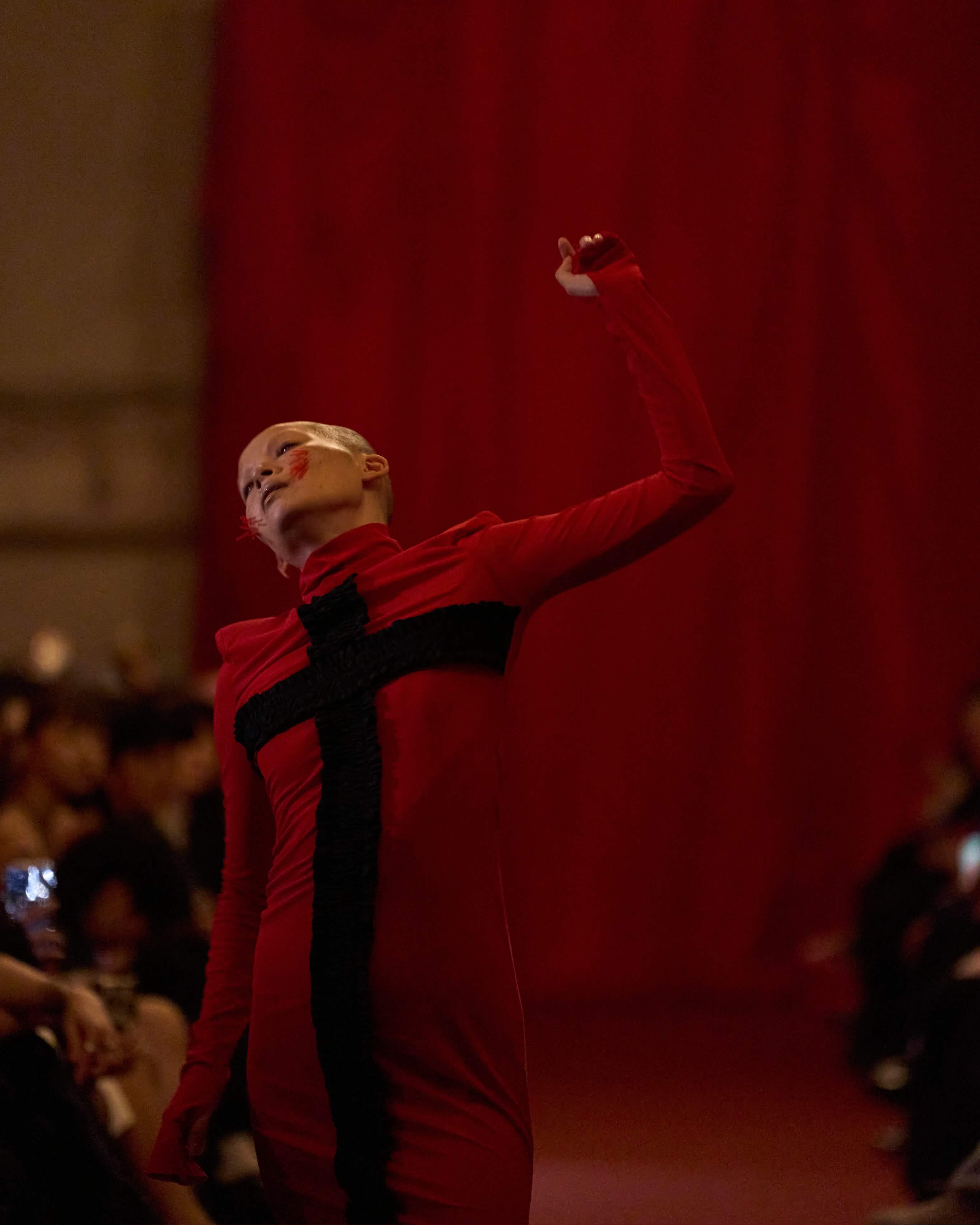 JENN LEE十週年大秀以當代舞蹈藝術家劉奕伶的現場演出揭開序幕。她身穿量身訂製的「緋紅十字緊身洋裝」,在舞台上透過舞蹈展現肢體與服裝交織的張力。延續與台灣高端中醫美容品牌巧絲顏的合作,針灸針被轉化為時尚配件,劉奕伶臉上布滿的紅針,成為當晚最具衝擊力的視覺符號。
