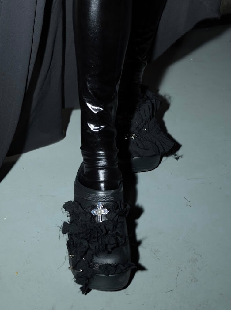 臺北秀上以Crocs圓潤的輪廓柔化了服裝的尖銳與俐落,JENN LEE將近乎人腳一雙的洞洞鞋全手工改造成飾以紅黑色流動固體及金釦金鍊的時尚造型,讓優雅與俏皮形成一種出乎意料卻又和諧的平衡。