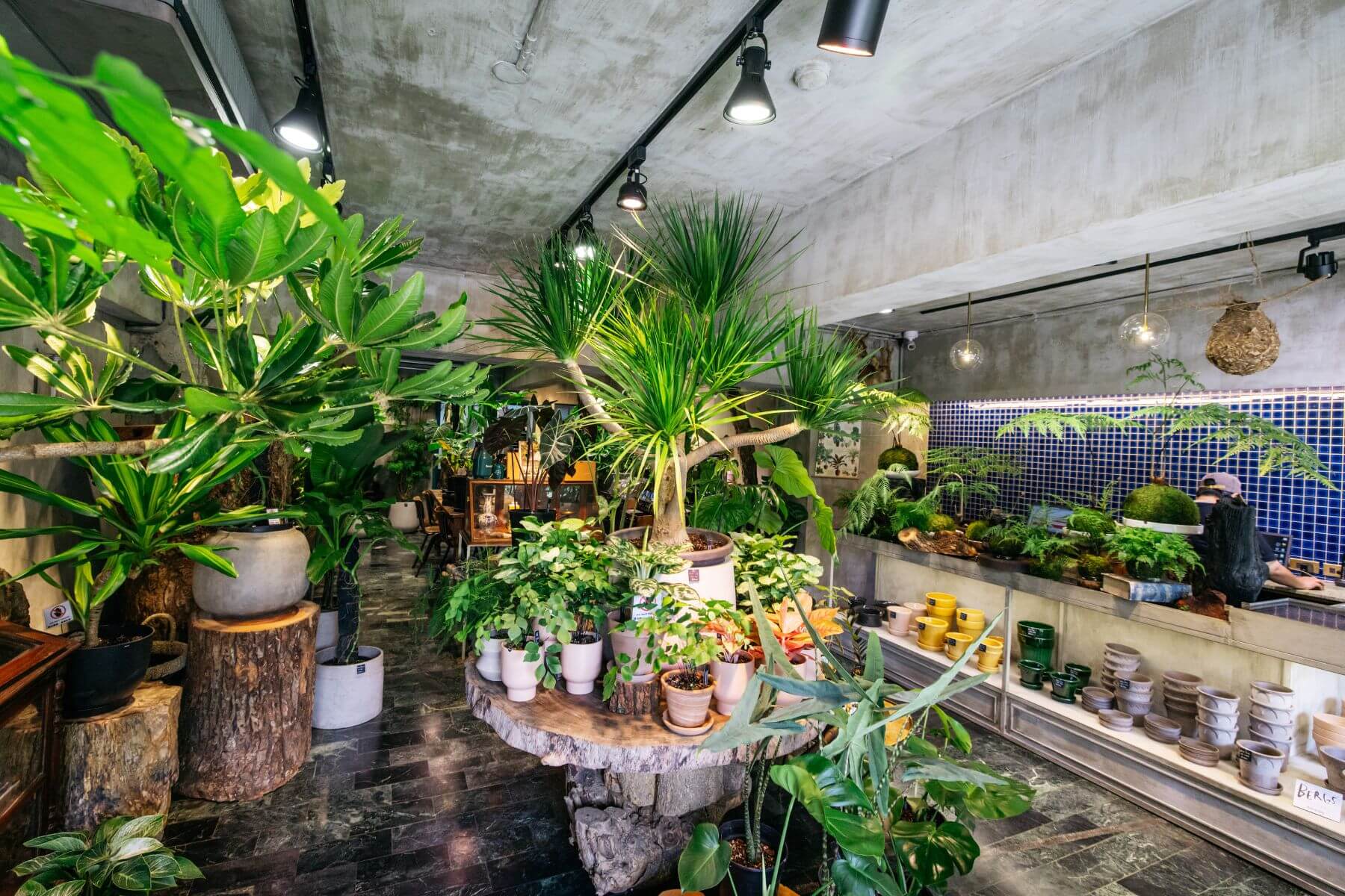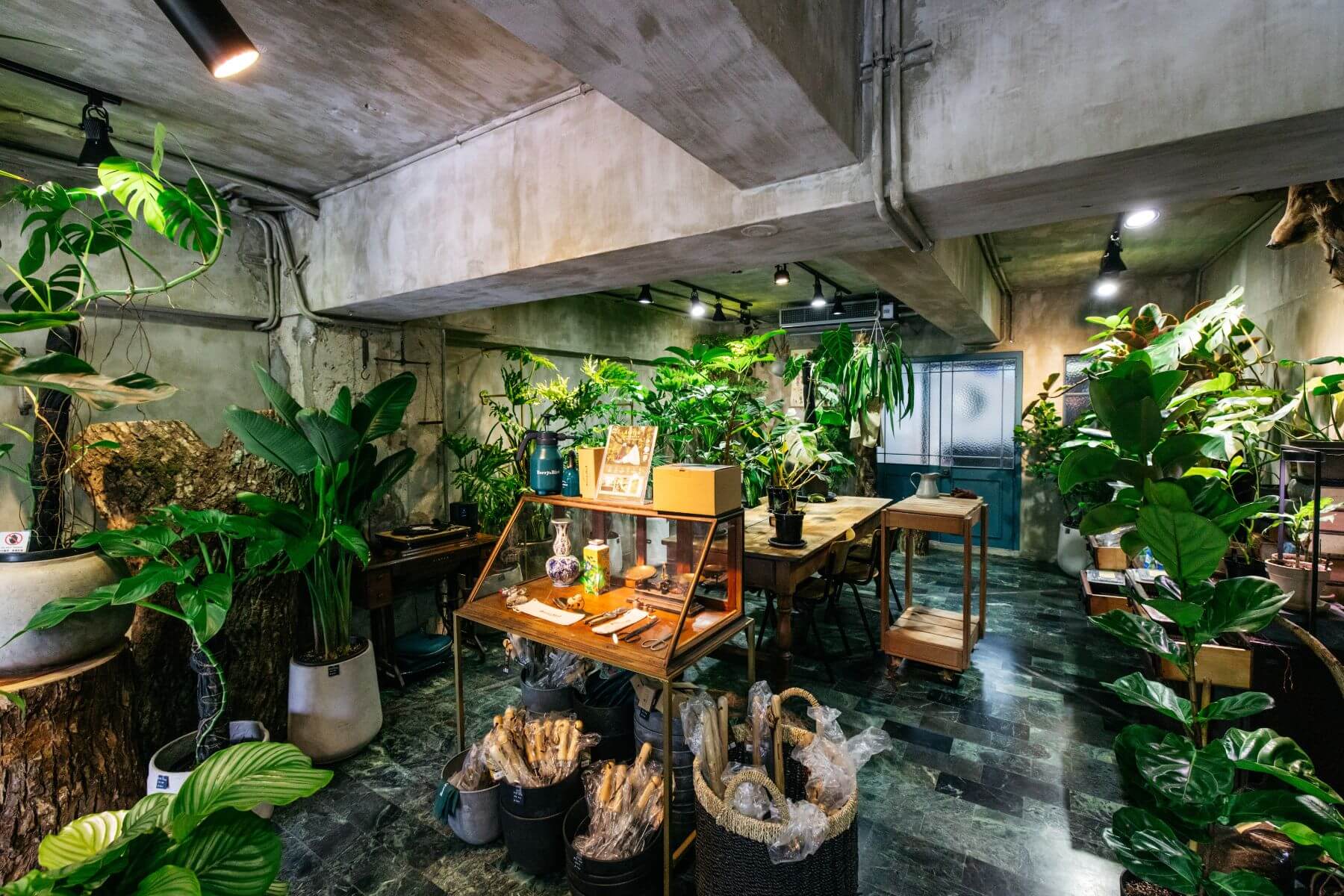 走進陳妍卉在台北建國南路的「樹園藝」旗艦店,微暗燈光灑落在各式深淺不一的綠葉。質感器皿與合夥人創作的鐵件錯落在木色桌椅旁,耳邊不時傳來播放的鳥鳴聲,搭配墨綠色地磚、灰藍色牆磚,讓人有走進歐洲庭院的錯覺。