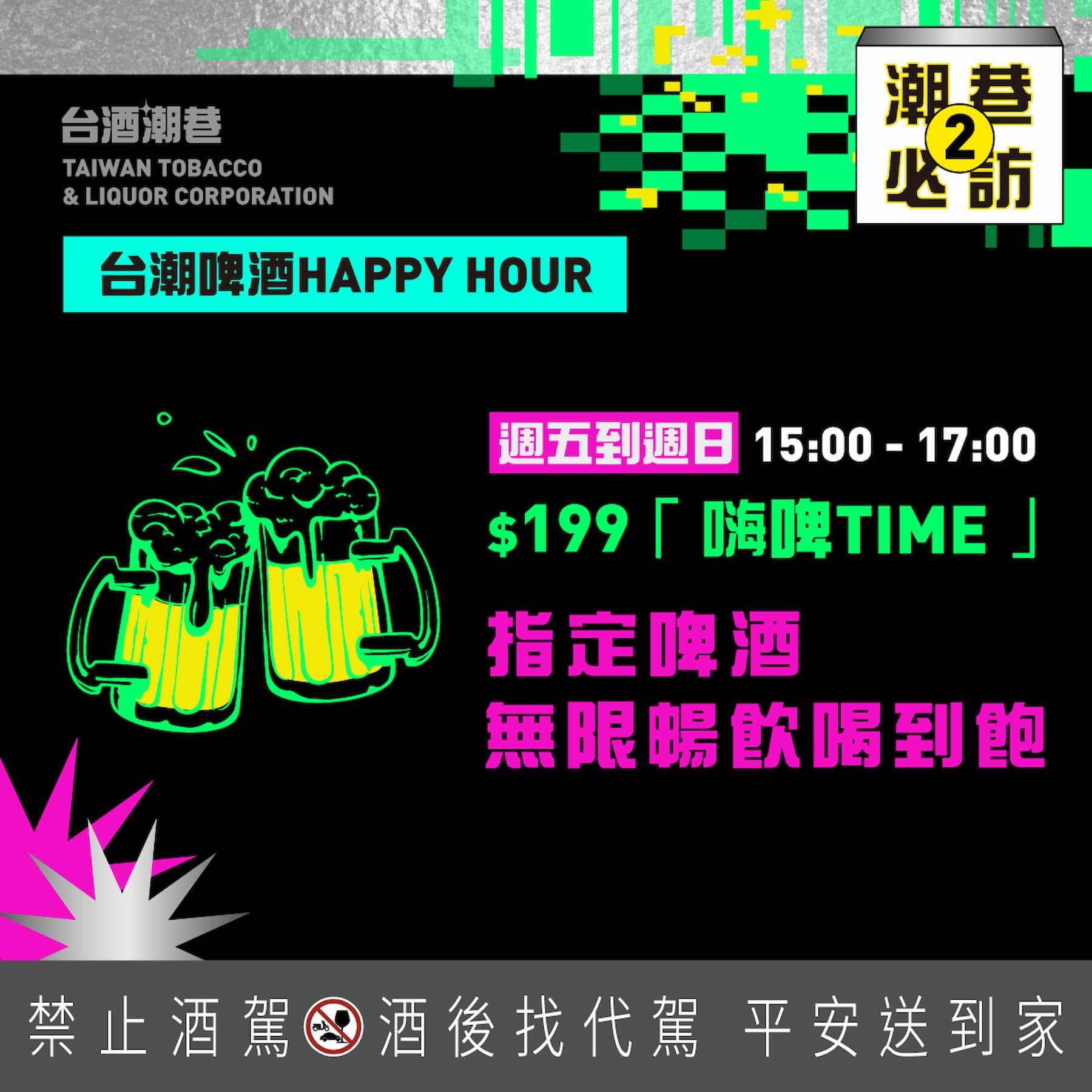 現場不僅可品嚐各式經典酒款及其衍生出的特色調酒,展期5/5(五)至5/7(日)15:00-17:00時段亦規劃有Happy Hour活動「$199嗨啤TIME」:只要199元,便能享受指定酒款喝到飽,限時限量的活動,非常推薦給喜愛啤酒的朋友們,在沉浸於台灣古早時光中,亦維持體內的快樂酒精濃度。