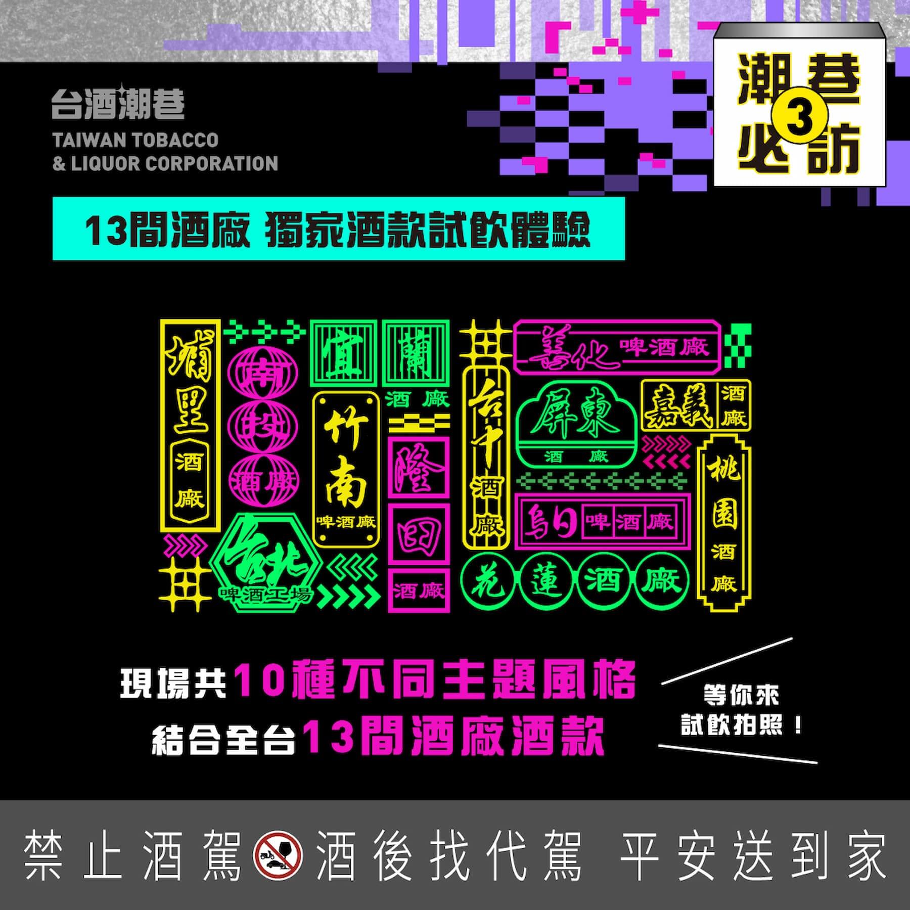 在人們逐漸告別疫情後,台酒也將創新理念濃縮、規劃舉辦「台酒潮巷」特展,期望結合感官體驗及新潮元素,並帶來全台共13間酒廠的酒類產品,展出啤酒、威士忌、高粱、清酒與小米酒等超過100款經典酒品。