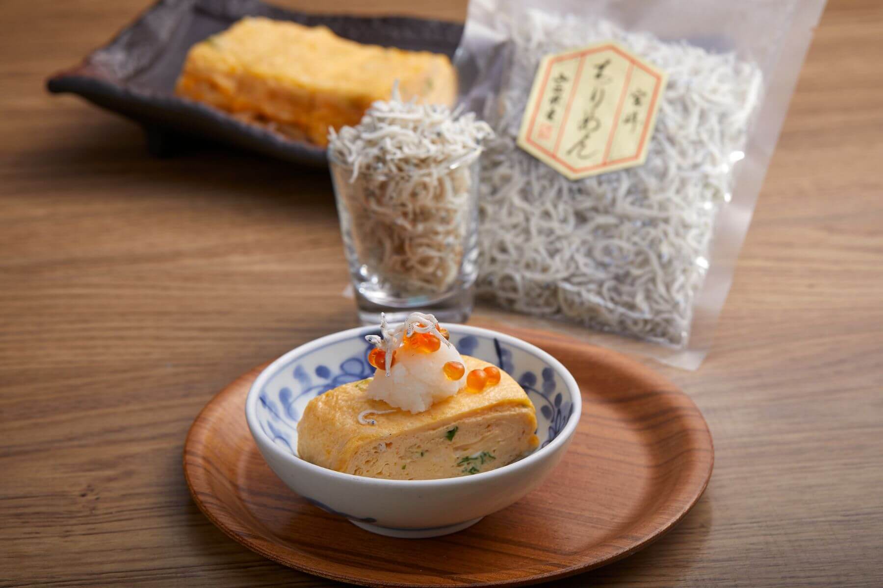 另款加入山西水產特上日曬吻仔魚的「小魚乾玉子燒」,口感柔嫩且吃得到小魚鮮美海味。由山西水產船隊於宮崎近海捕撈的鯷魚、沙丁魚等小魚,單純只添加日本產海鹽日曬而成的山西水產特上小魚乾日曬吻仔魚,尤其從漁港到加工廠只有8公尺的距離,加上日曬後冷凍保存並透過莫札特音樂的電磁波減少結晶化,從捕撈、日曬、靜置保存到每一環節不容許忽視鮮度的執著,使得日曬吻仔魚擁有極高品質。
