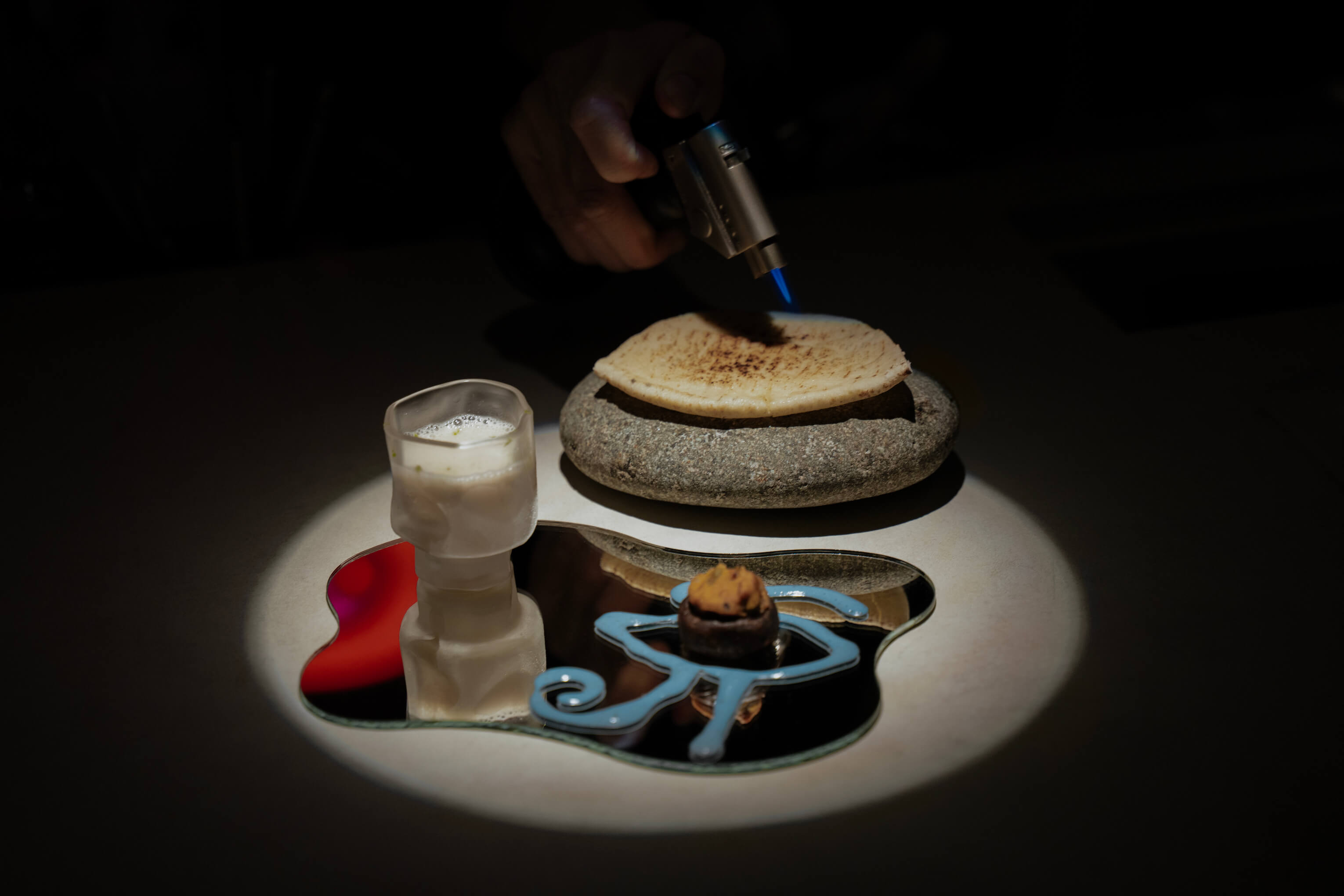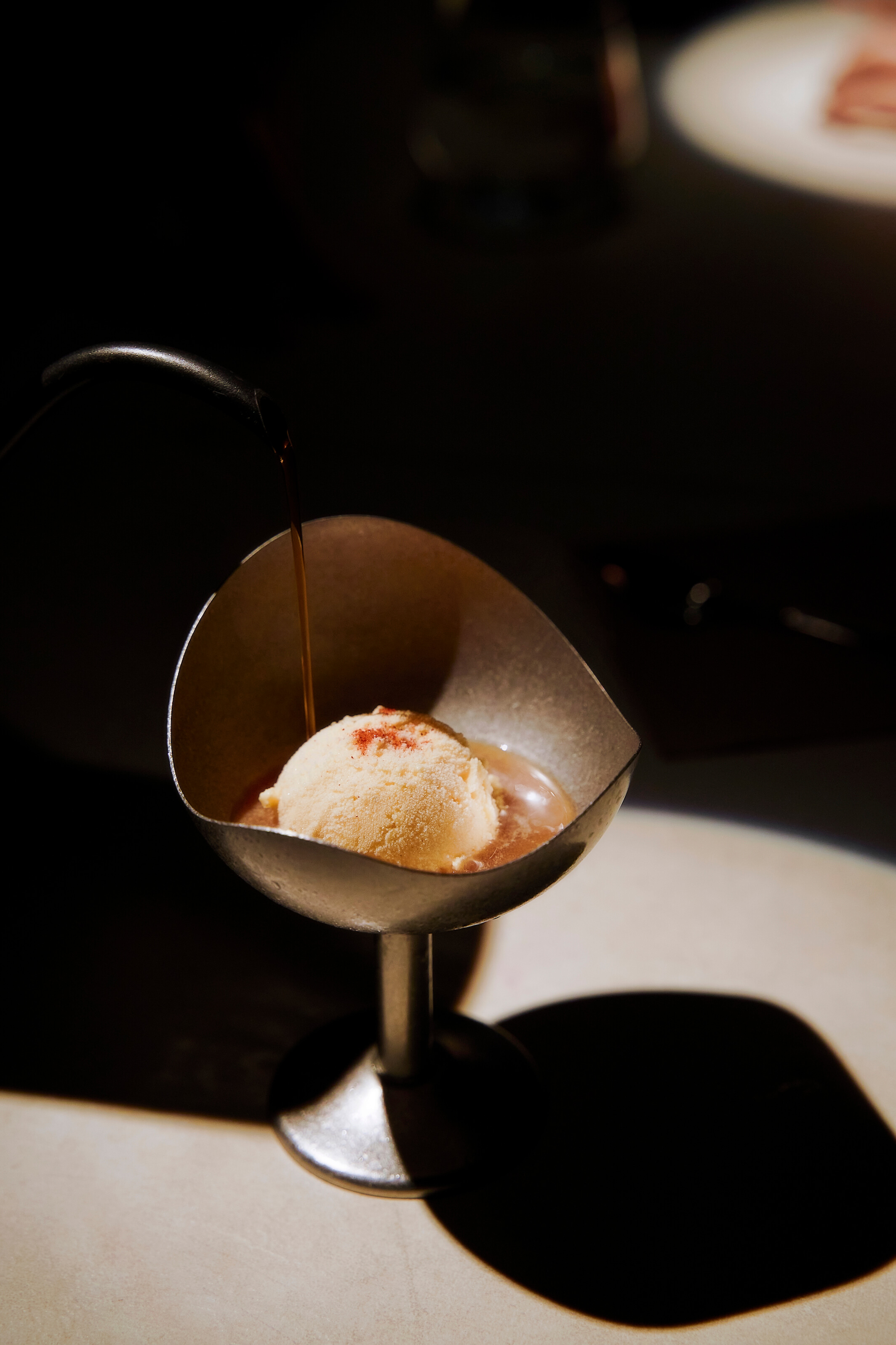 這道「沒有咖啡的 affogato」先送上駱駝奶番紅花冰淇淋,然後在桌邊注入熱雞尾酒。冷熱交錯的瞬間,就像在極端溫差下仍持續流動的沙與風。最後一口入喉時,整晚的光影與幻象像跑馬燈般在腦海中閃過。