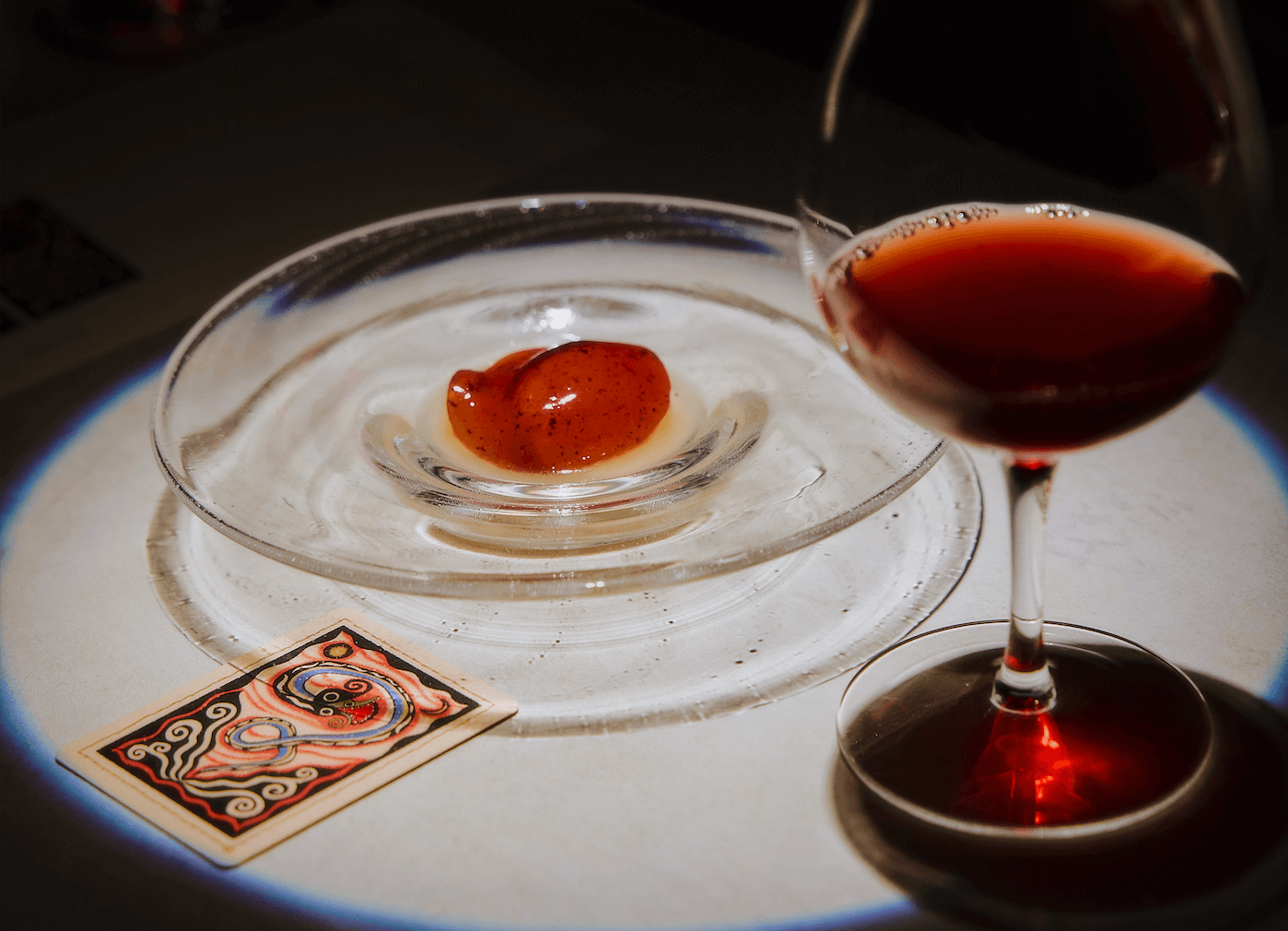 卡牌背面印有一段梵文,服務人員說意涵會在套餐中段揭示。那一刻突然理解,這場旅程設計的巧妙之處:它不急著給答案,而是讓人帶著疑問前行,讓每一道菜、每一杯酒,都成為解謎的線索。