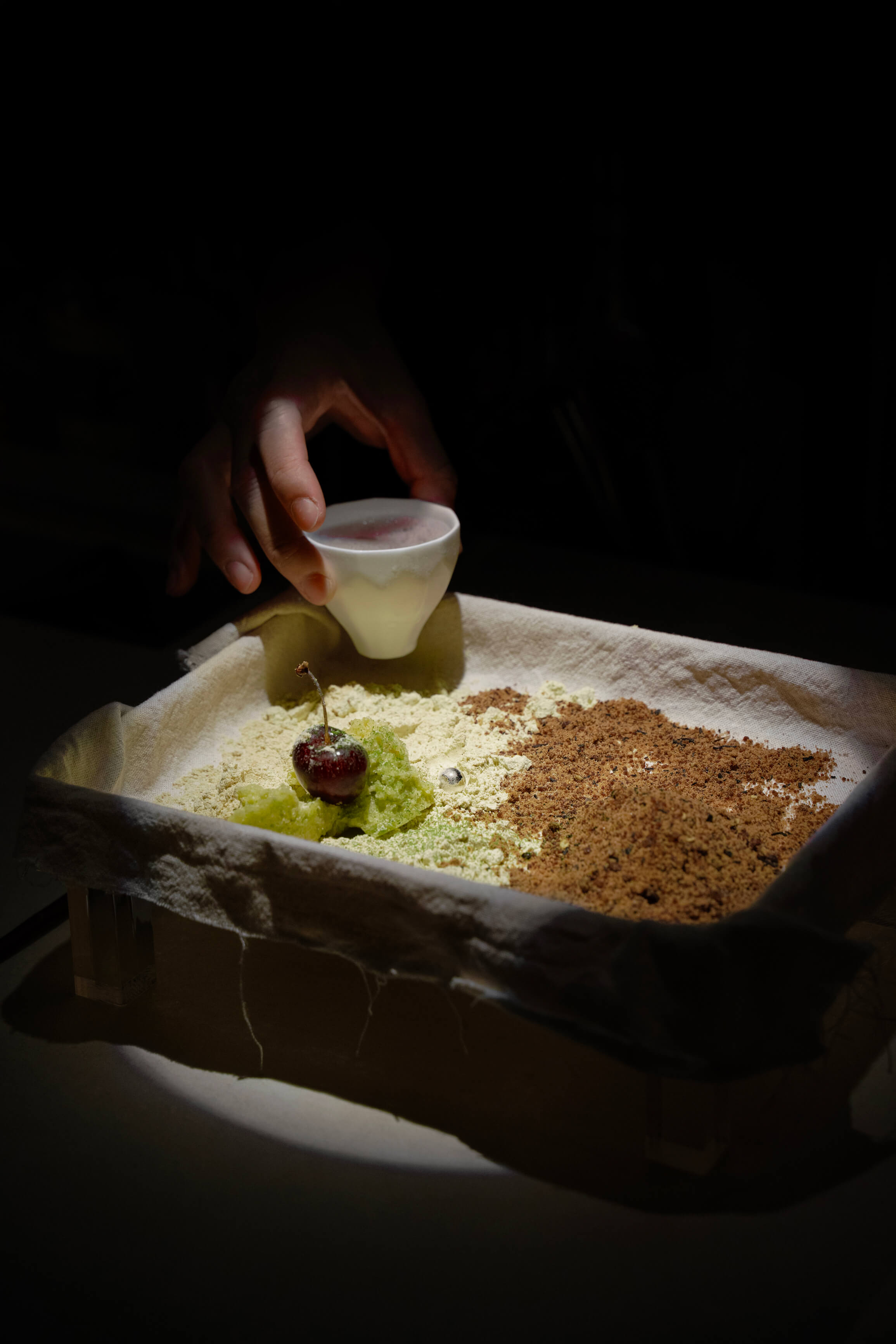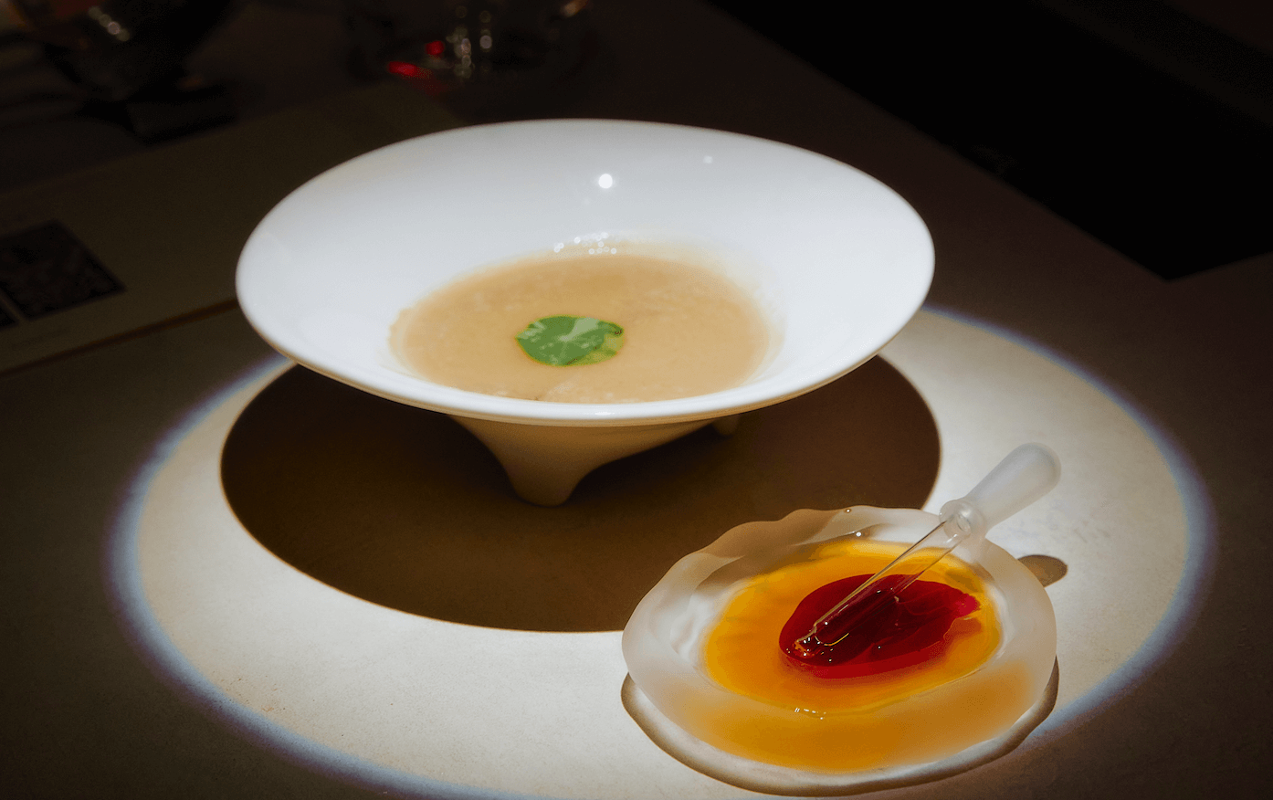 套餐的核心「沙漠中的水母」終於登場時,現場燈光配合調暗,音樂轉為低沉的節奏。鴕鳥肉與韭花上覆著紅肉李酒製成的果凍,淋上柴魚昆布高湯打出的泡沫,形成水母停留於沙面的意象。