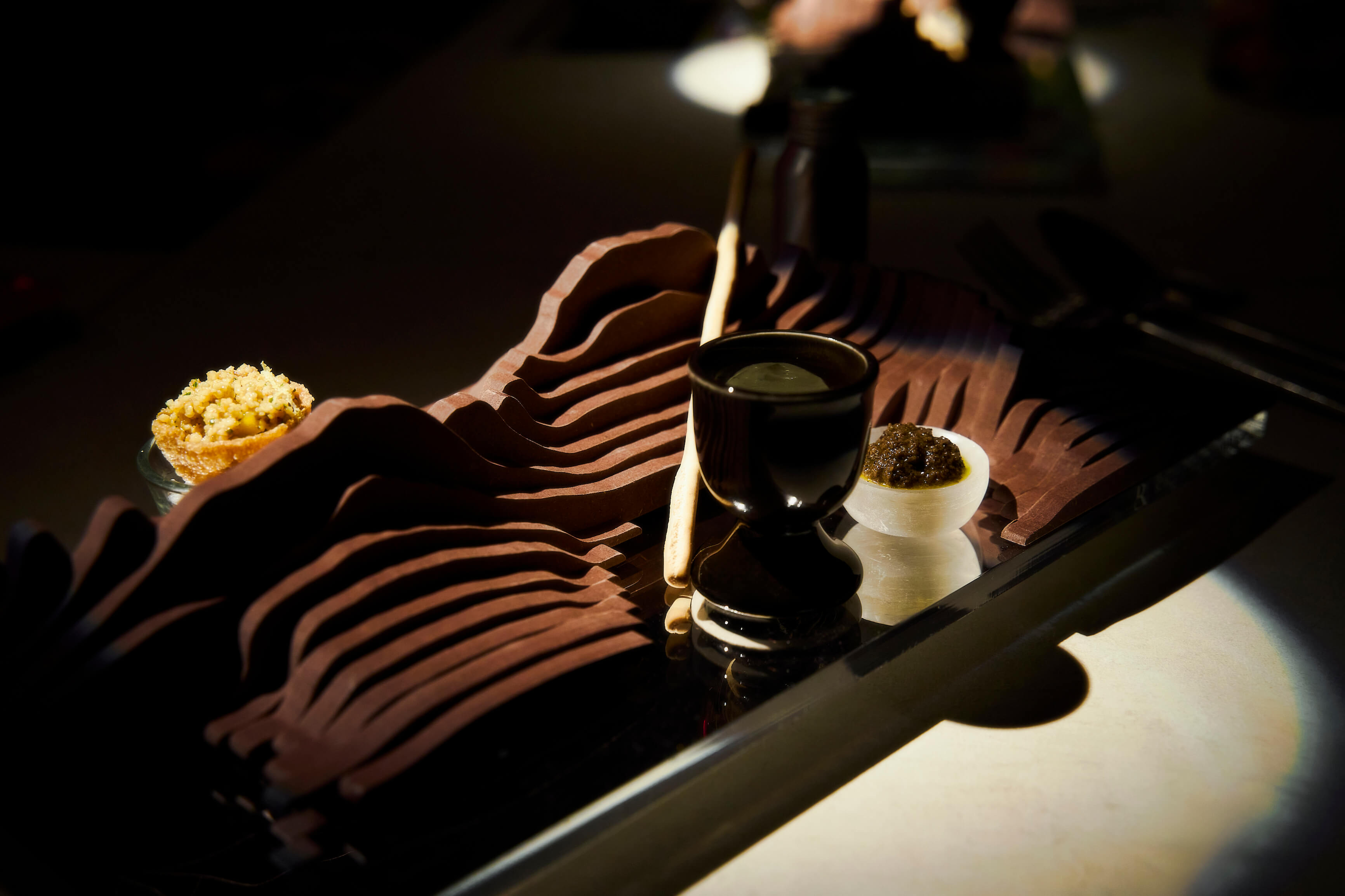 「移動的市集」這一道,讓人第一次真正理解什麼叫「器皿也是敘事的一部分」。由 RADIUS Interior Design 伴境空間設計的木質底座,那些起伏的線條確實像沙丘,但更像是旅途本身——有高有低、有明有暗、有裂縫也有倒影。