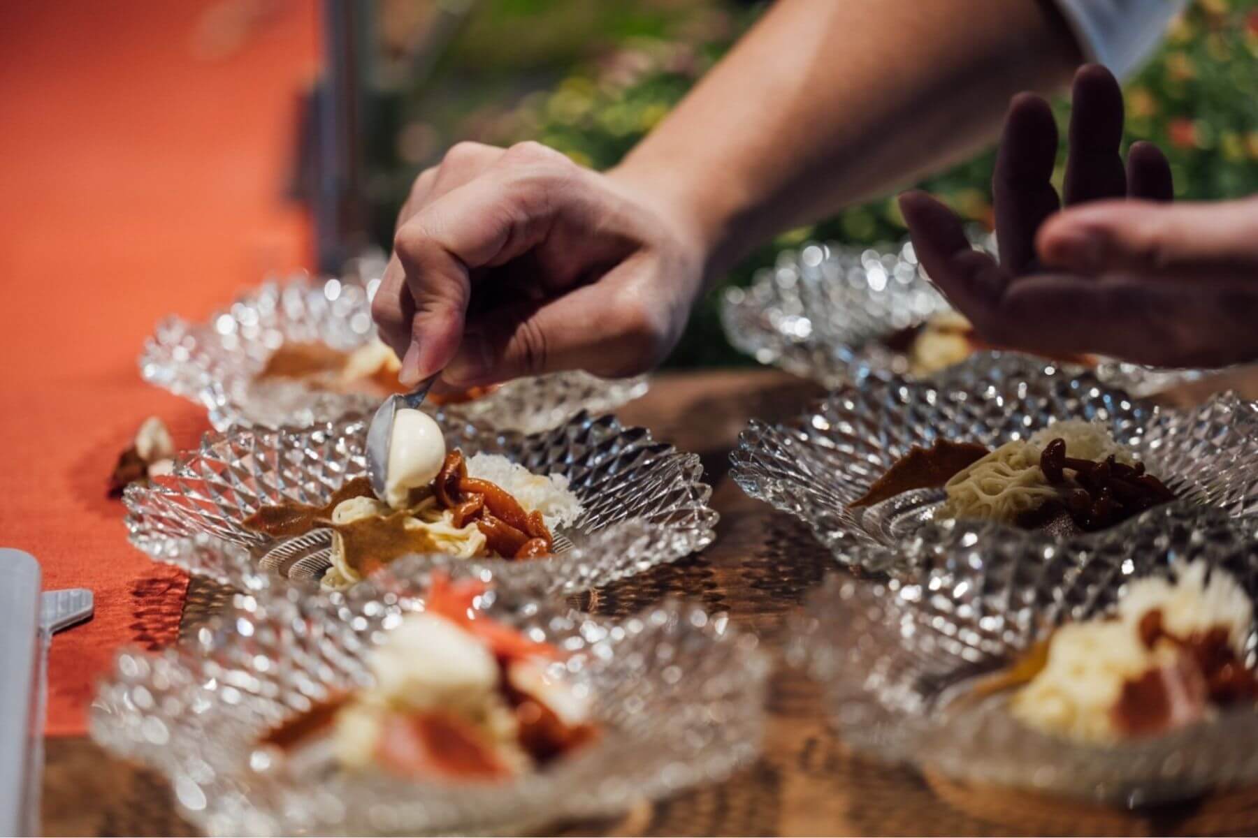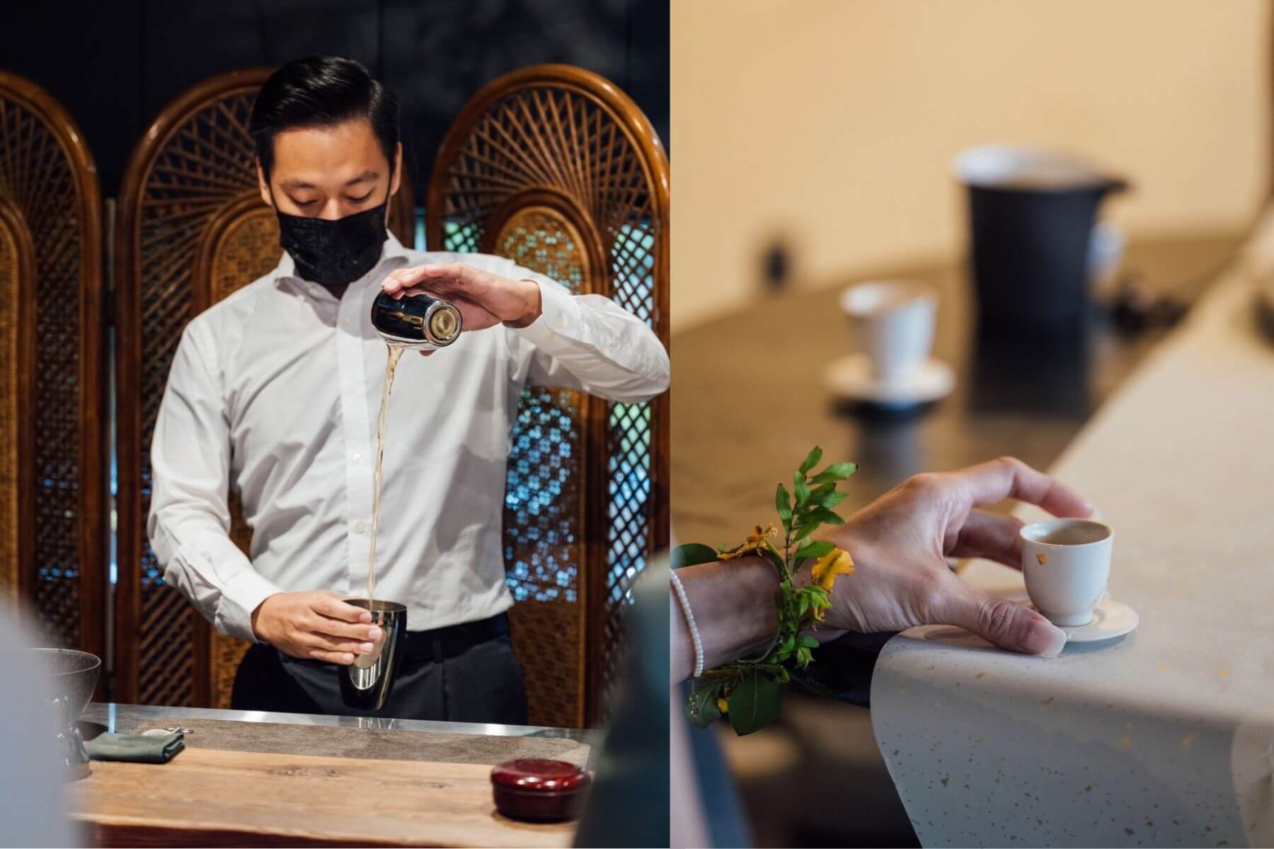 鄭茗謙則選擇台灣特有的東方美人茶,搭配台灣當代陶藝家的精巧茶具,茶席襯底灑金宣紙,既呼應「茶金」也延續雅集入畫的傳統;莊子德融合古代茶法添加香料平衡茶性與當代調酒概念的茶調飲;戴峻弘則昇華古典時新嘗鮮的概念,以應時食材搭配不同茶品,更分別擔任春、夏、秋的季節流光。