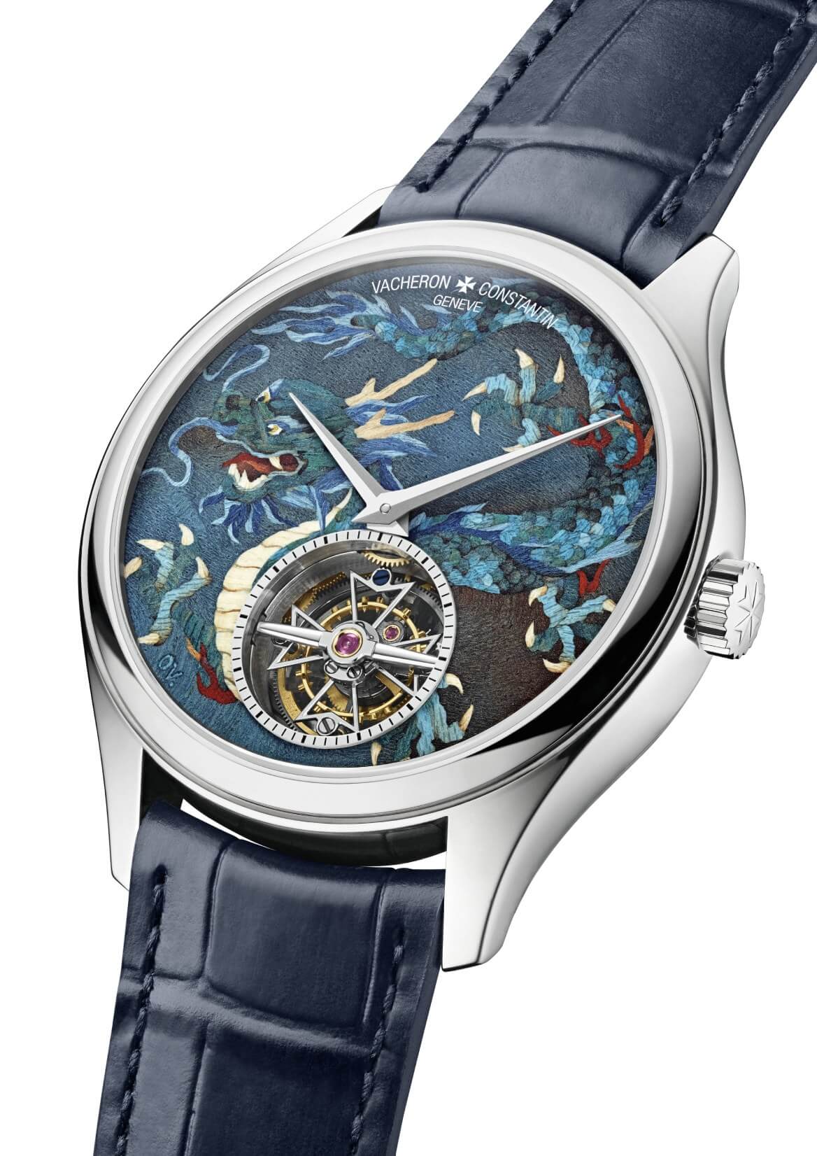 為了營造空靈縹緲、似幻或真的立體感,每一只面盤都先以手工雕刻大師耗時 20 小時精雕,創造出薄霧、祥雲與浪花,面盤並塗覆以利摩日白釉,歷經六至七層釉料、每一層皆重複進行大明火(攝氏 800 至 900 度)燒製,最後再加上兩層半透明釉料後進行拋光潤飾,令其栩栩如生、古典內蘊。機芯皆使用江詩丹頓自製 2460 或 1440 自製自動上鏈機芯,皆通過日內瓦印記認證,具備時、分顯示功能,限量各一只。