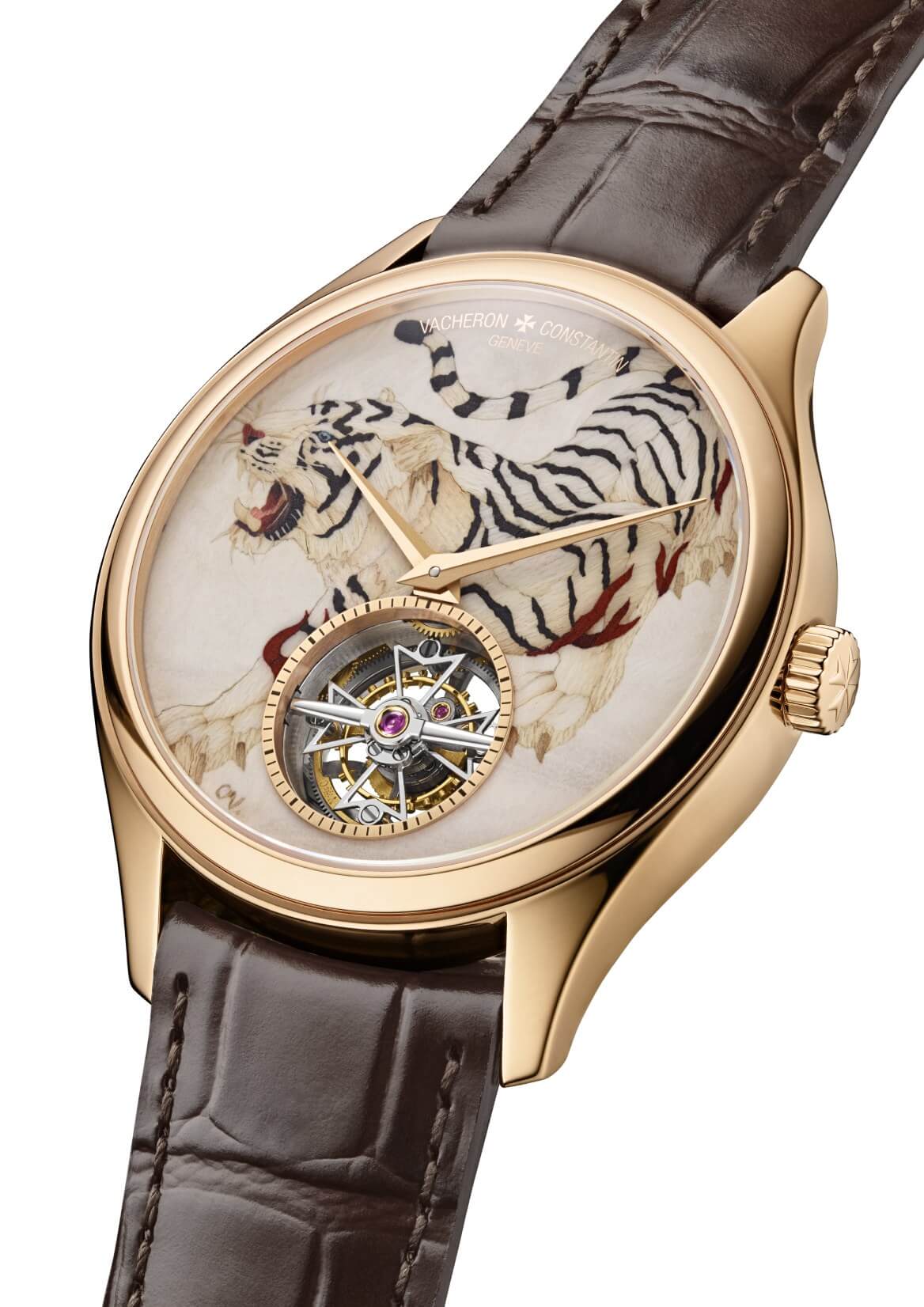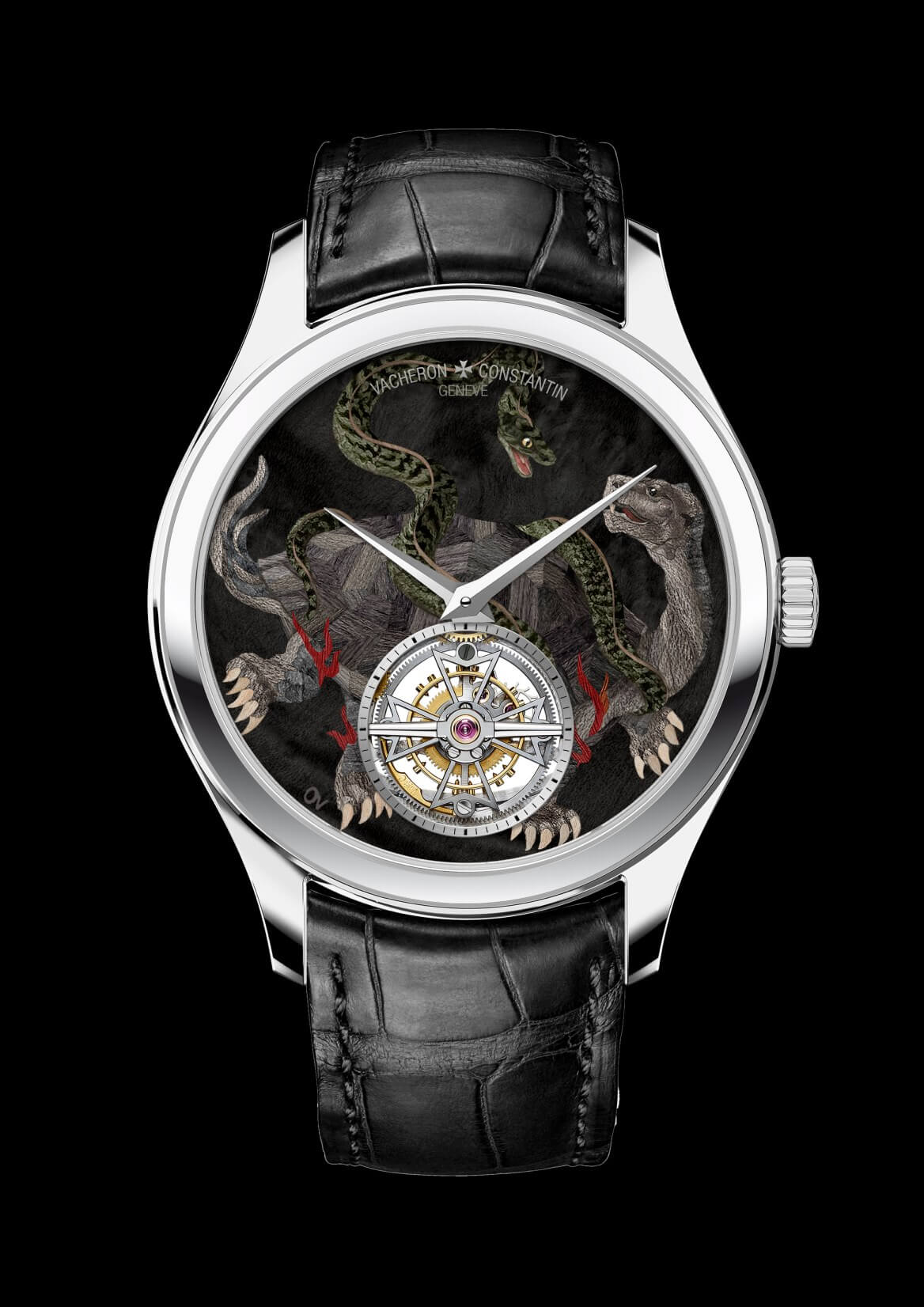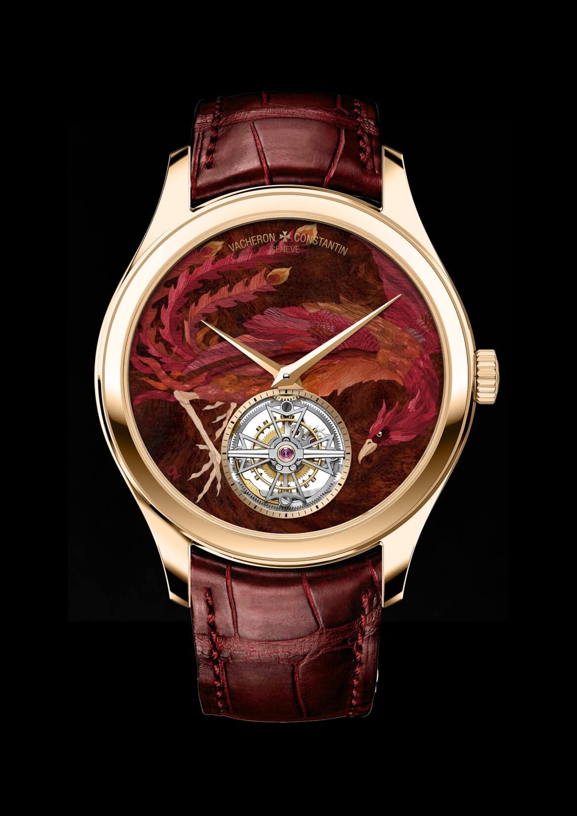一枚由上百件微小纖細木片組成的細木鑲嵌面盤,需歷經至少 12 道工序,尤其 Ode to the four Guardians 腕錶平均採用 10 至 12 種木材、合計超過 200 片細木鑲片,耗時 4-6 週製 作,加上用色明亮而不顯突兀、正符合亞洲文化的內斂與節制。同時錶款選用了江詩丹頓自 製之 2160 超薄陀飛輪自動上鏈機械機芯,188 個零件組成的 2160 機芯具備時間顯示、與附帶小秒針功能的陀飛輪、邊緣式自動盤,厚度僅 5.65 毫米,並通過日內瓦印記認證,青 龍、朱雀、白虎、玄武四主題分別搭配 18K 白金、18K 5N 粉紅金,皆為獨一無二之作(Pièce unique)。