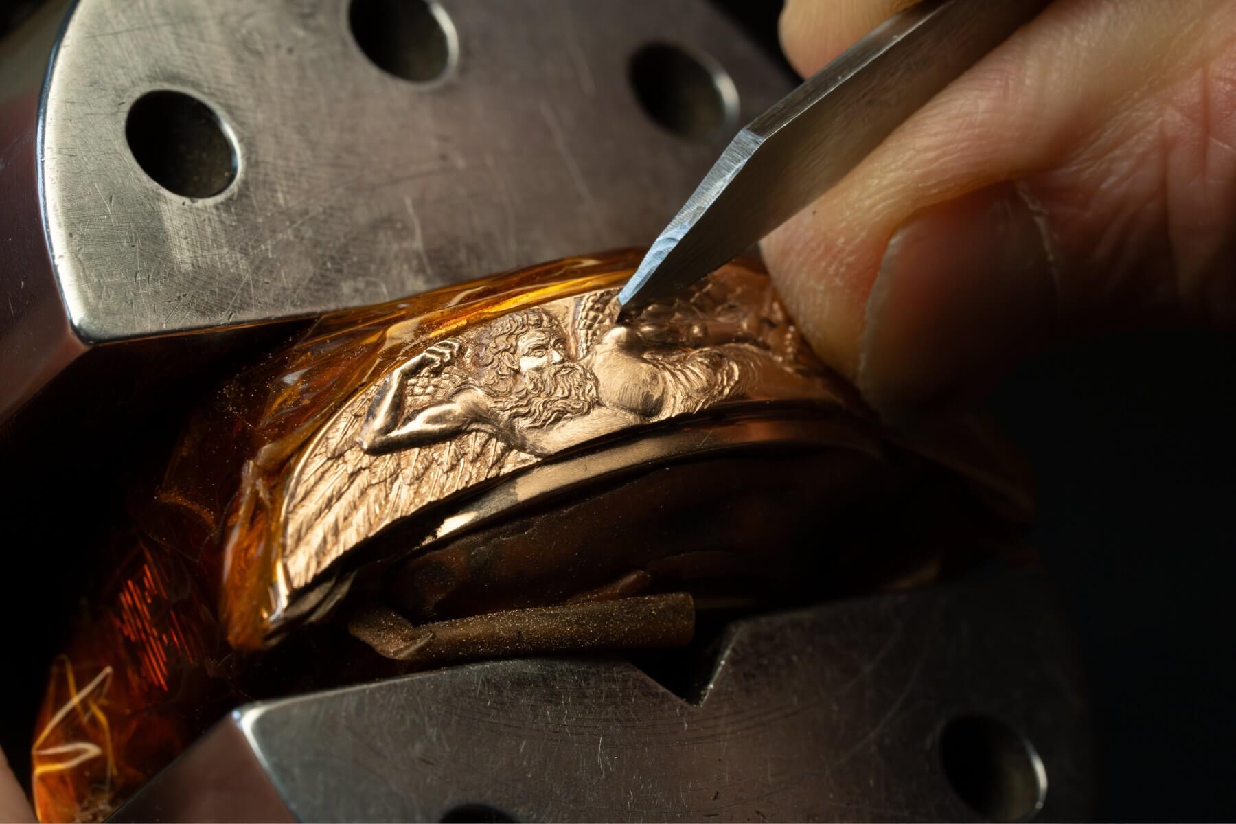 兩只錶款的「Ode to Chronos 渾天儀式陀飛輪」結合了淺浮雕工藝,將手握沙漏的時間之神 Chronos 的形象,身展雙翼、現身於天空和雲朵之間的時間之神Chronos,其厚度各為 0.5 毫米與 1 毫米,單手工雕刻便耗時 290 小時,同時底蓋再刻有古羅馬箴言:「珍惜當下」(Carpe Diem);「Tribute to infinite time 渾天儀式陀飛輪」是將羅馬萬神殿(Pantheon)中的穹頂,透過手工雕刻大師的斜面蝕刻工藝,在 2D 平面中將放射狀幾何圖案賦予如金字塔般的立體層次。