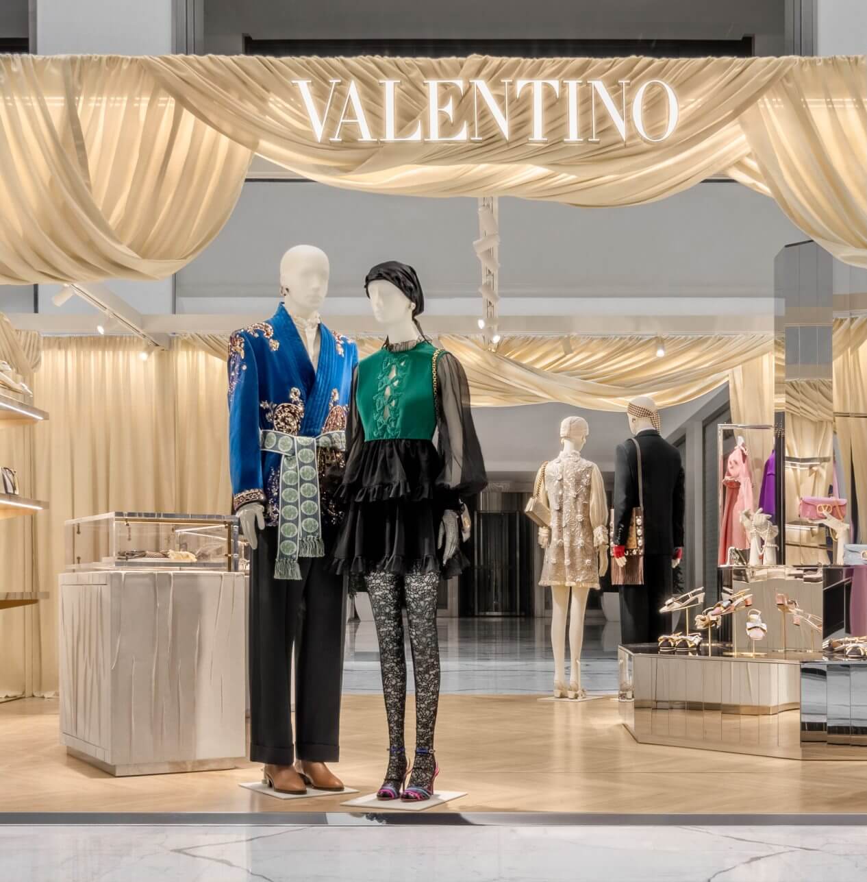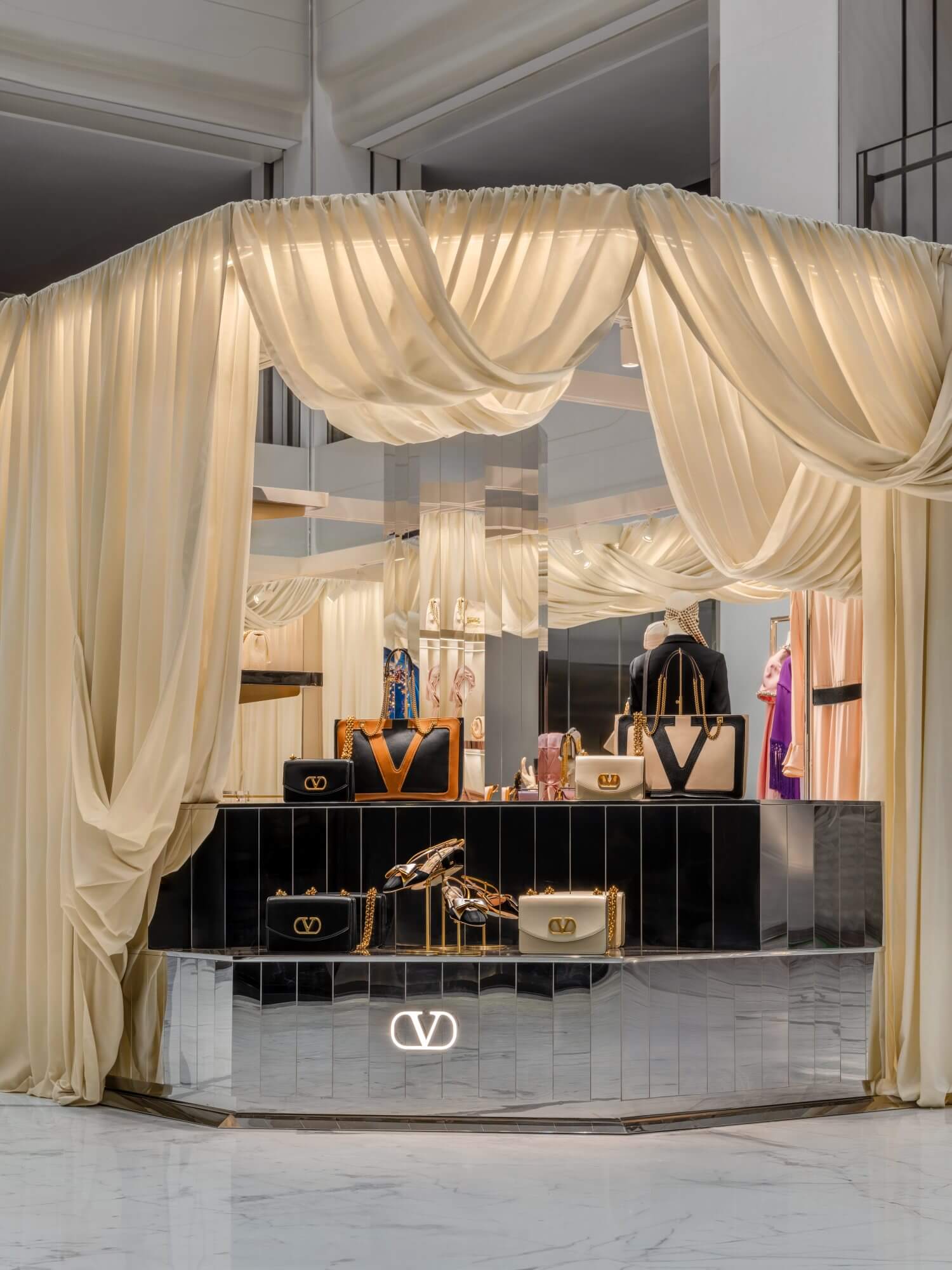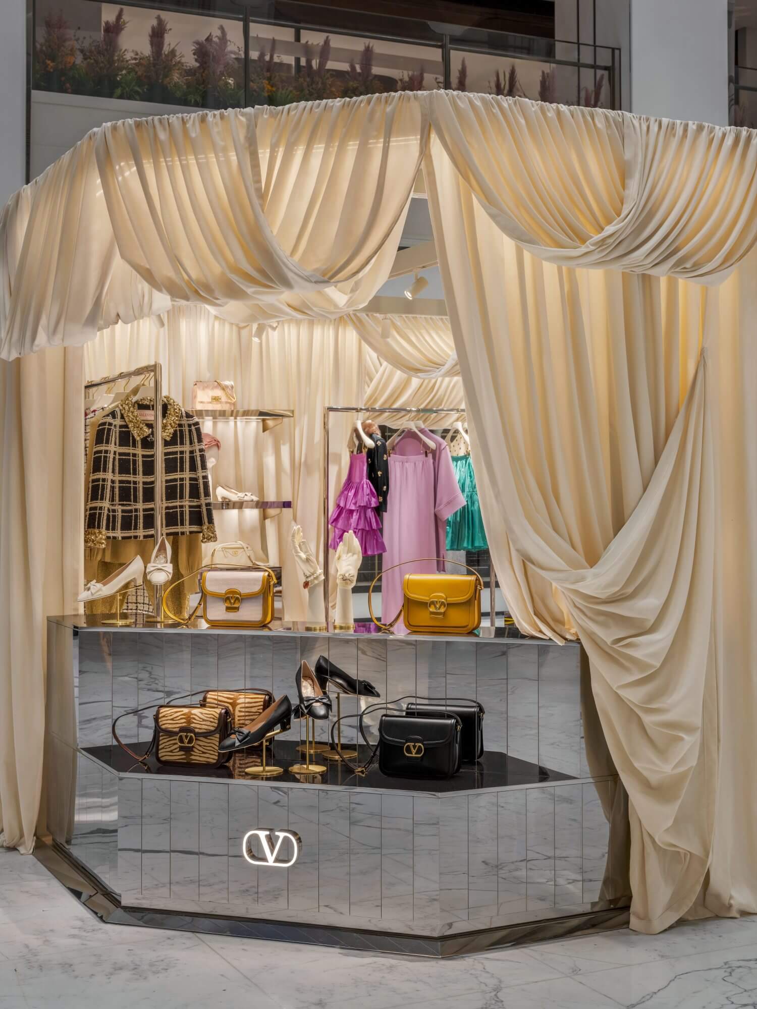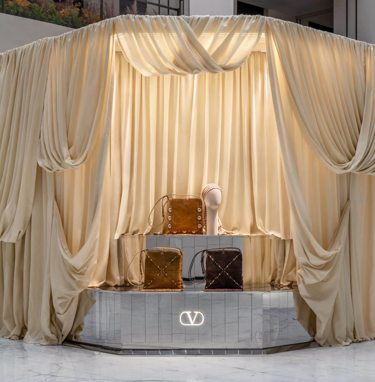 由Alessandro Michele親自構思的Valentino北京全新限時概念店,邀請張柏芝、楊紫、等影視名人出席,店鋪移植9月秀場設計,透過象牙白布幔、鏡面營造如夢似幻的浪漫空間,木質地板與陳設突顯雅緻、柔美的復古風,也讓人彷彿踏入一場復古與嬉皮交織的宴會,展現不同於前Valentino創意總監Pierpaolo Picciol的極簡風格。
