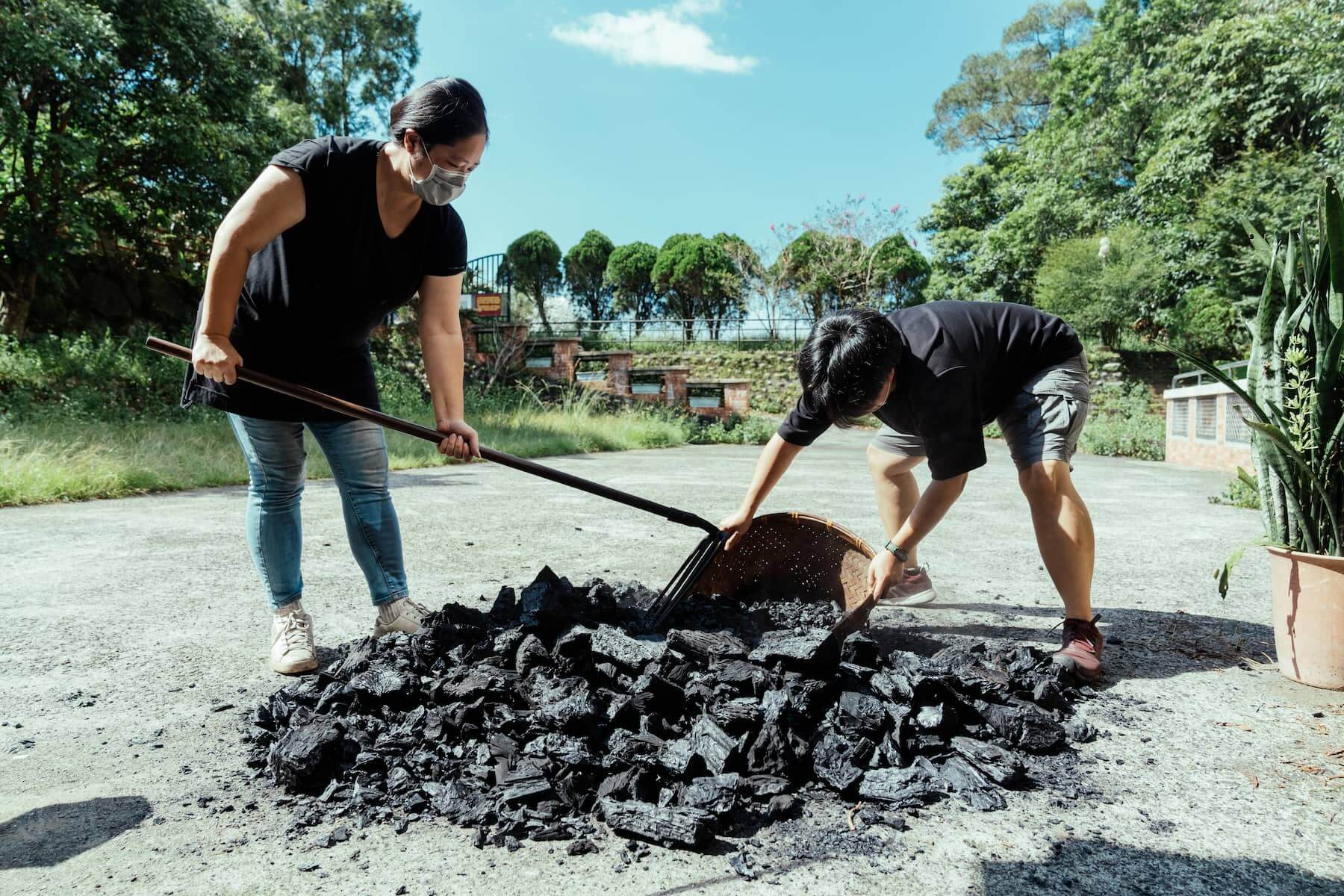 六月貓空老泉山上,杏花林休閒農場裡的杏花還未開,裏邊一處平房,正看見張協興茶行的焙茶師,在碳焙室準備碳焙茶葉。先將木碳擊碎,填進深度60 公分的地窟中,接著把木碳錘實,排出空氣,避免火過度燃起,最上方放置碳化稻殼,然後點火,燃起的微火會慢慢往下燒,經過一、兩天的悶燒,整個焙坑的碳火都是穩定的文火,外表看來沒有半點火光,這才是碳焙茶葉的開端。