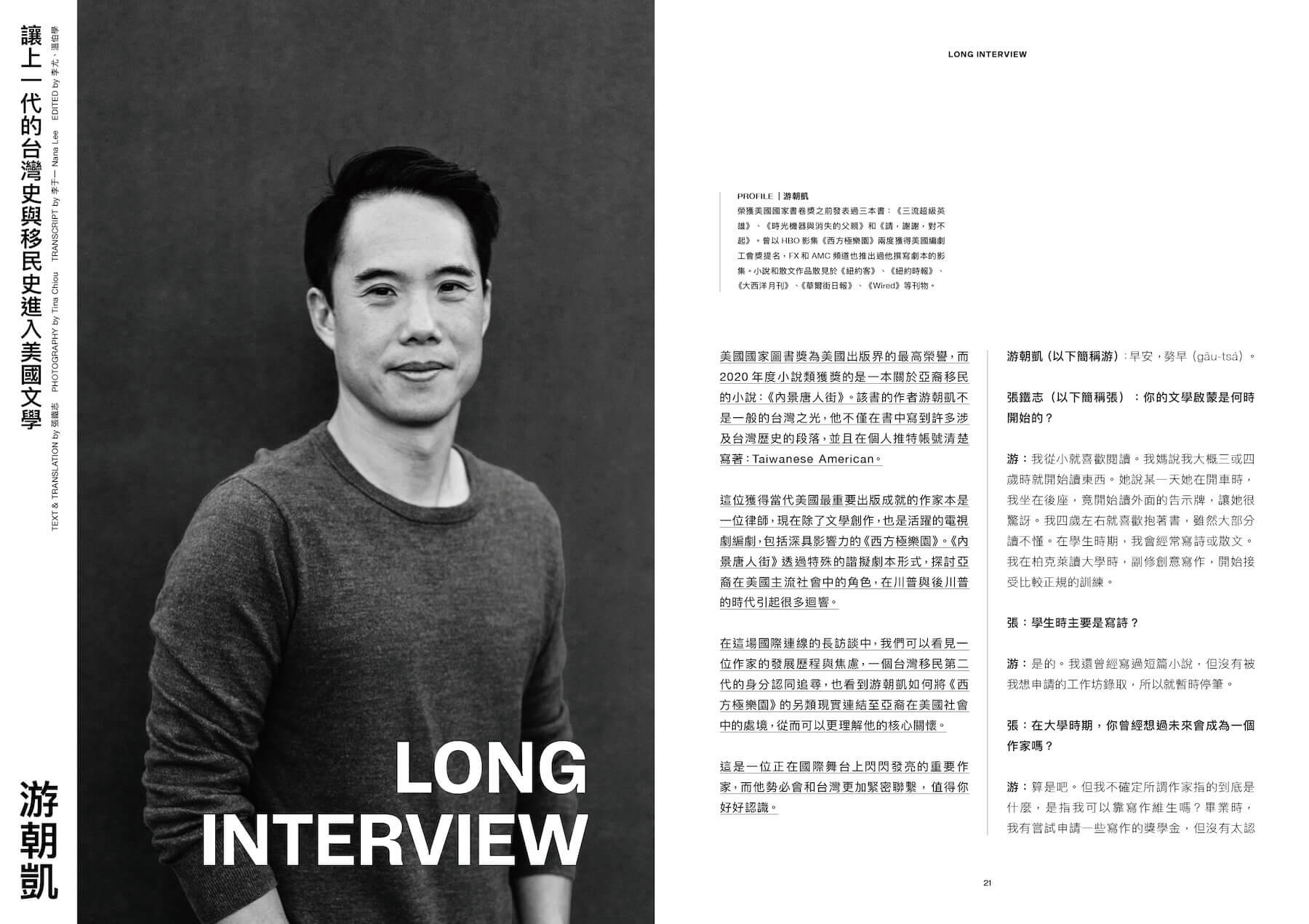 本期的Long Interview第一次走出台灣,越洋專訪榮獲2020美國國家圖書獎的台裔美籍作家游朝凱,謙虛的他誠懇分享台灣身分對他的意義,以及他如何將父母輩的移民歷史放進獲獎作品《內景唐人街》中。我們也首次觸碰司法議題,探討即將成真的國民法官制度將會如何改變我們的司法體制。