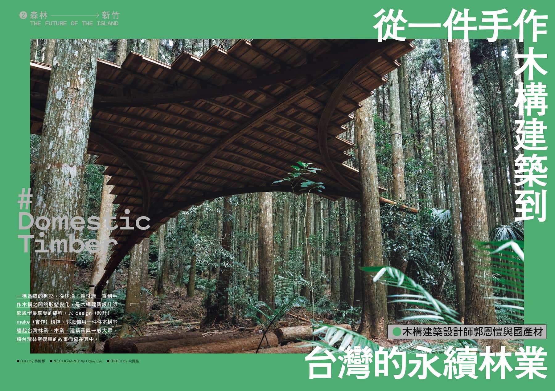 COVER STORY 36 永續行動關鍵字 38 MUME 與永續食材指南⚫好好吃一頓飯,用食物選擇想要的未來 44 Bar Mood Taipei 吧沐⚫在地食材入酒,打造以永續為概念的酒吧 48 木構建築設計師郭恩愷與國產材⚫從一件手作木構建築到台灣的永續林業 56 台糖沙崙智慧綠能循環聚落⚫如同大自然循環再生,綠建築的最後一哩路 62 小智研發⚫燃燒吧火鳥!把垃圾化為獨一無二的性感建材 66 達魯瑪克綠能電力公司⚫一場從綠能實驗開啟的部落自主之路 74台灣海鮮選擇指南與洄遊吧⚫從海鮮文化到海洋文化,「好好吃魚」推廣永續 80 世代 50 彭啟明⚫永續是一種文化展現 82 世代 40 陳惠琳⚫永續是我們這一世代的責任 84 世代 30 李霈瑜⚫用溫柔陪伴,一起愛地球 COVER PEOPLE 88 焦安溥⚫「我就在那裡,寫我一輩子的字。」 |