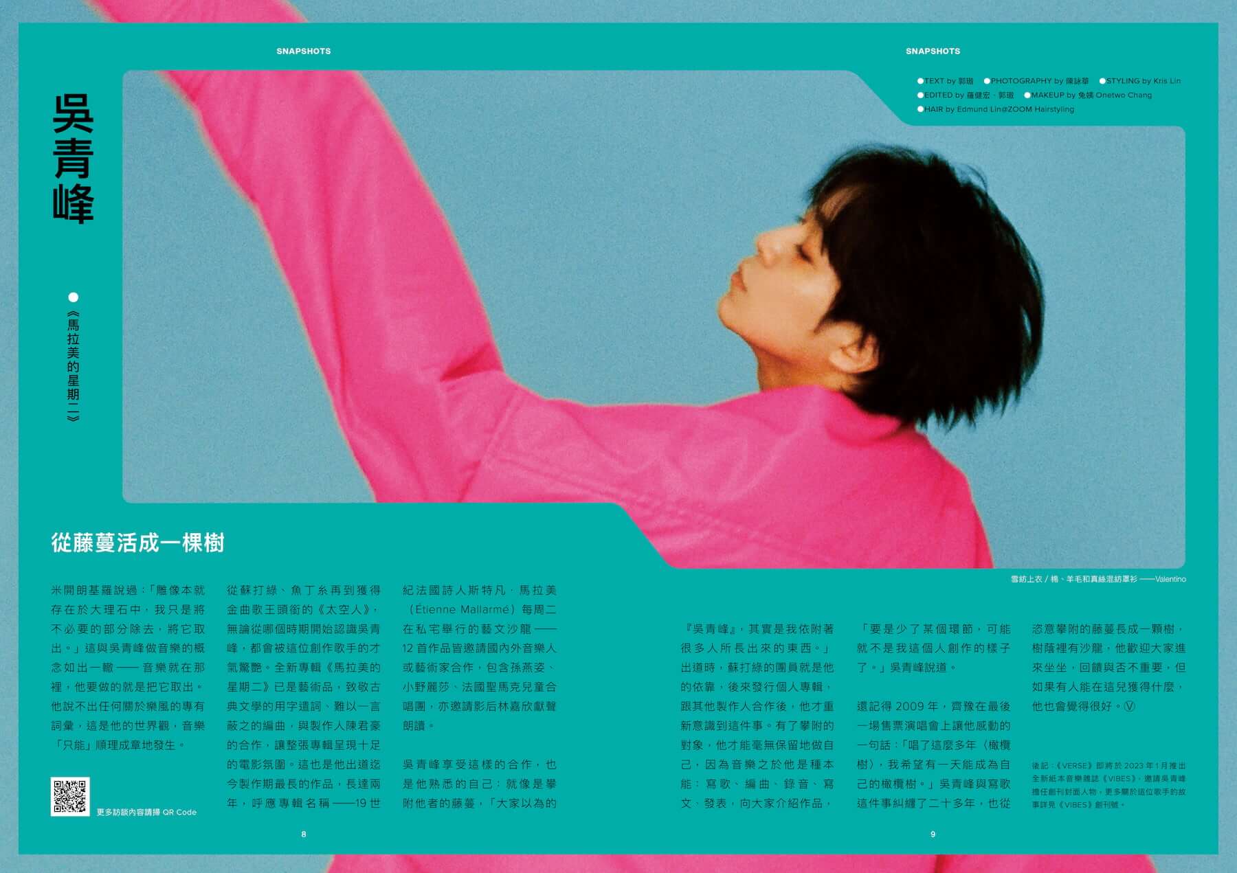 這期的「Snapshots」單元是兩位大明星:一位是曾演出過電視劇版《孽子》,並入圍今年金馬獎最佳男主角的張孝全(VERSE官網上有更完整深入的報導);另一位是同樣挑戰既有性別框架的吳青峰,但他出現在這裡並不是因為本期的封面故事,而是因為另一個即將現身的封面:《VERSE》將出版一本全新的音樂雜誌《VIBES》,青峰就是創刊號的封面人物之一。這本全新的音樂雜誌將用和《VERSE》相同的精神,以精彩的文字、炙熱的影像與前衛的設計,去記錄與論述這個時代的音樂文化,為正在湧現的創作浪潮搖旗吶喊。