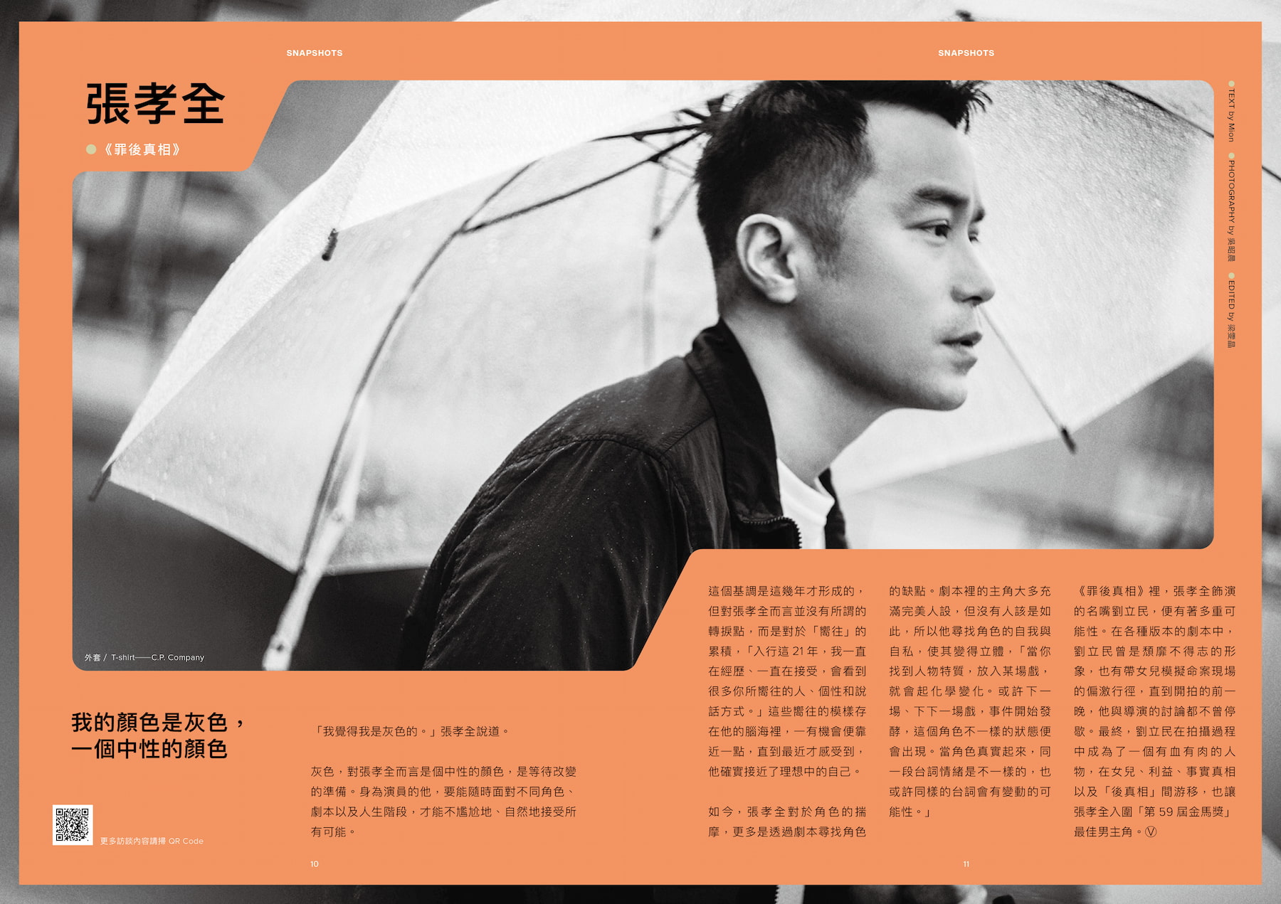 SNAPSHOTS 08 吳青峰⚫從藤蔓活成一棵樹 10 張孝全⚫我的顏色是灰色,一個中性的顏色 |