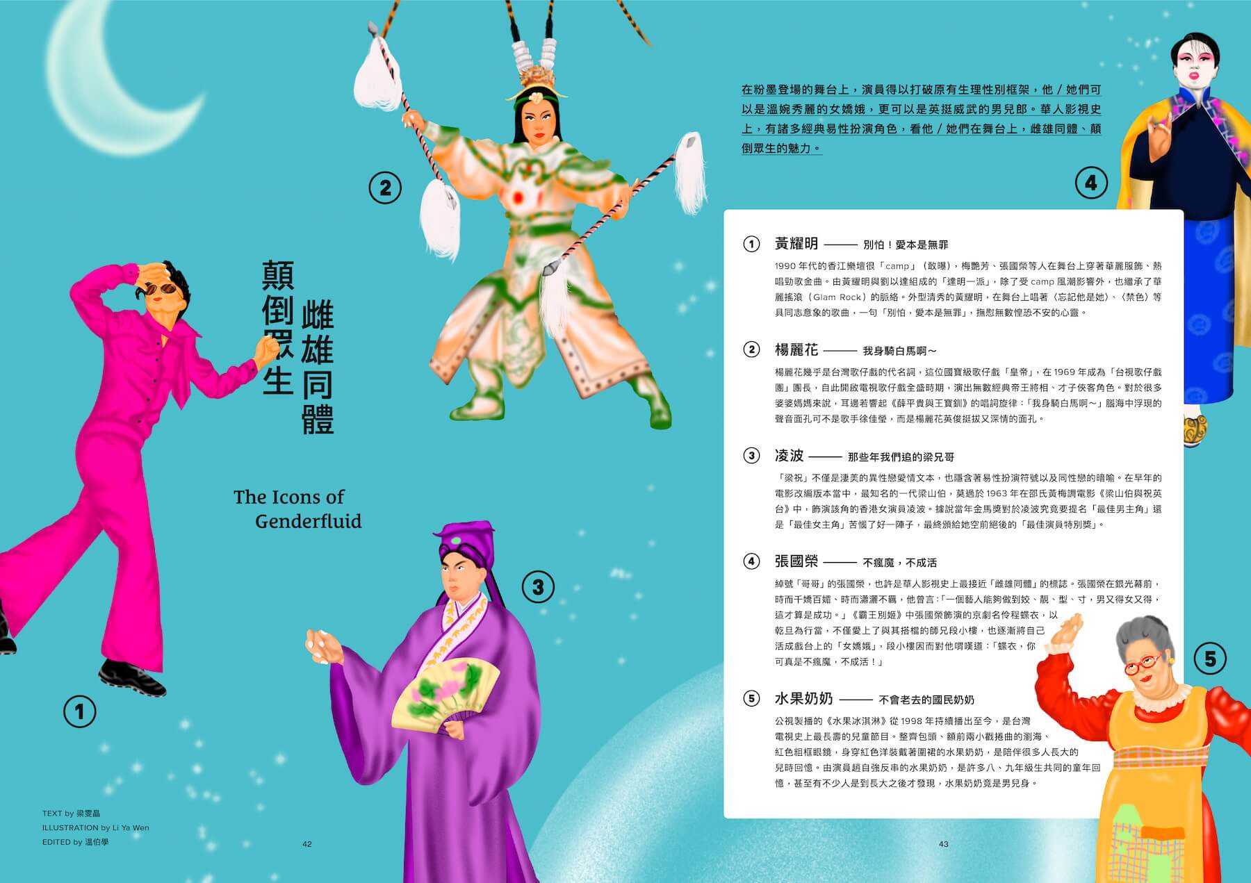 COVER STORY ICONS 40 雌雄同體,顛倒眾生 TAIWANESE OPERA 42 女身男相,盡情展演⚫歌仔戲的坤生文化與易性扮演 46 陳亞蘭⚫當(女)演員演活了(男)主角 DRAG QUEEN 56 在妝前裝後之間⚫登曼波╳變裝皇后薔薇家族 MODERN ART 64 余政達⚫酷兒藝術就是一種框架 70 Li Ya Wen⚫用畫筆與遠行,在無人知曉之地探索自己 MEDIA 74 林志杰⚫娛樂,是酷兒改變世界的一種方式 THEATER 80 趙啟運╳簡莉穎⚫流動後持續發浪 BOY'S LOVE 86 在BL的世界裡只有愛,沒有性別框架⚫這裡是愛的烏托邦 LGBTQ+ 96 張藝⚫或許你不需要去管性別 100 愛里⚫千刀萬剮,再痛也要成為自己夢想中的樣子 104 林辰唏⚫我沒有辦法被任何東西束縛 108 性別不明關懷協會⚫我的性別就是me |