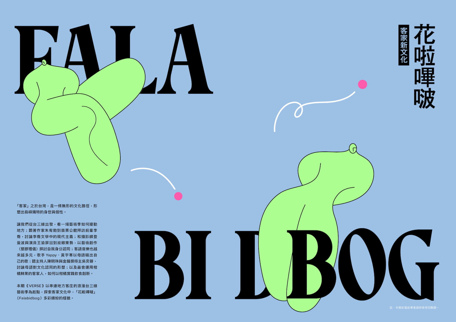本期《VERSE》呼應今年浪漫台三線藝術季的主題「花啦嗶啵」(Falabidbog)這是客語「多彩繽紛」的意思,試圖探索客家文學、身分、音樂、語言、飲食等各面向中,各種新的可能如何被建造。