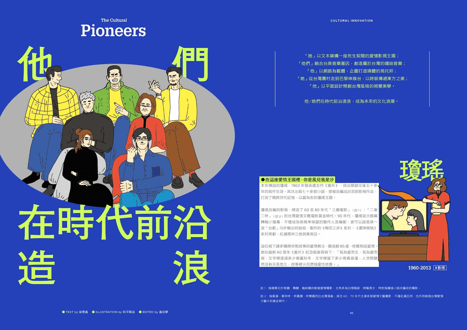 「封面故事」報導近十年來台灣舞蹈、時尚、策展、職棒領域中的重要文化創新者與新點子。編舞家鄭宗龍接任「雲門舞集」藝術總監三年後,持續創作引領雲門繼續前進的舞作;設計師汪俐伶、詹朴,以跨領域聯名、結合科技方式,為台灣時尚帶來新可能;叁式與La Rue文創設計,以數位科技、市集慶典,打破大眾對展覽的想像;台灣最受歡迎的運動職棒,在改革制度及加入啦啦隊應援文化後,又是如何再掀全民棒球熱?