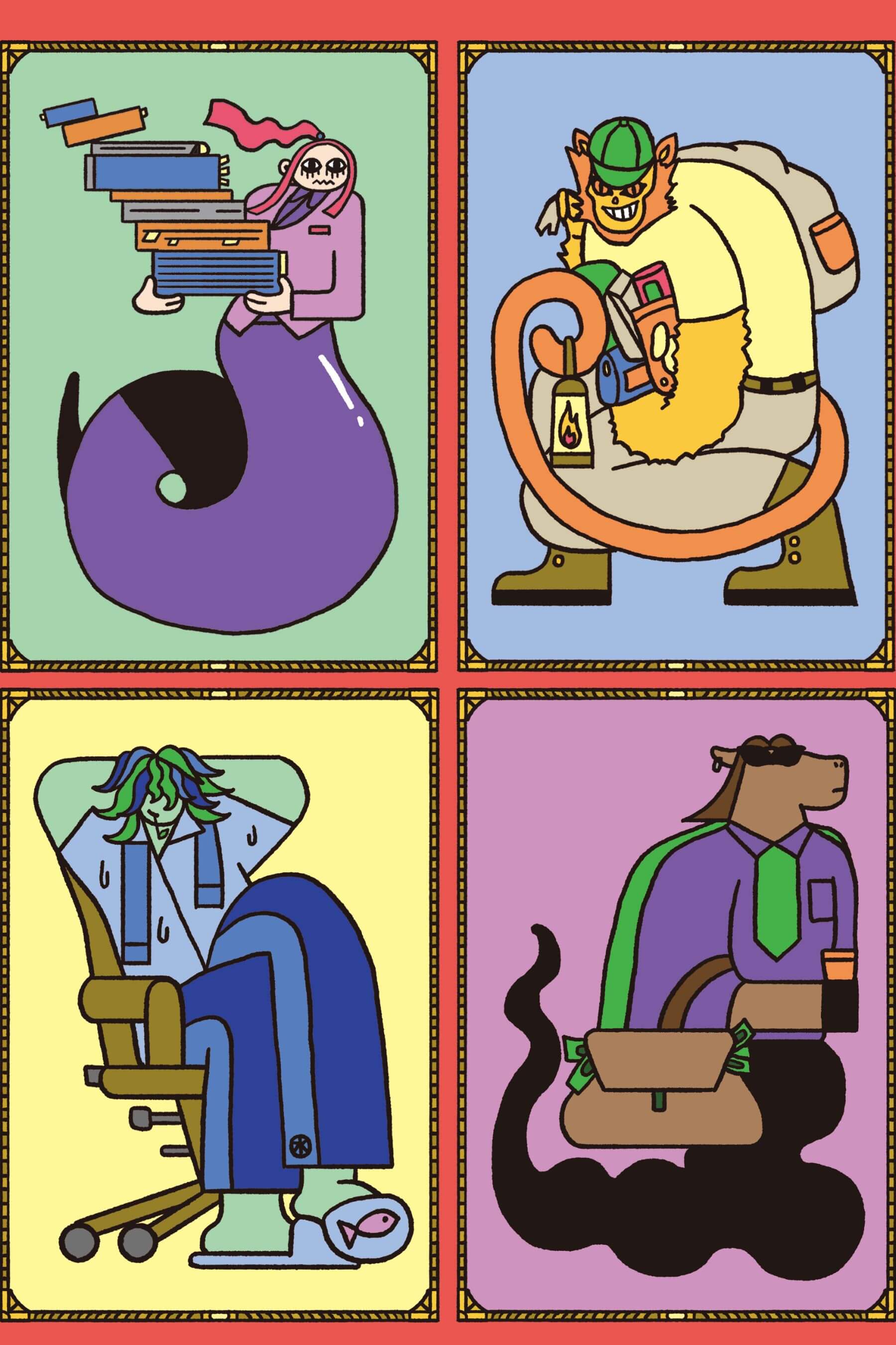 「Book Lists」單元介紹EMBERS主廚郭庭瑋的書單(左圖,插畫/火山販賣舖);「VERSE Test」透過台灣妖怪測試你在辦公室的人格特質(右圖,插畫/和平製品)。