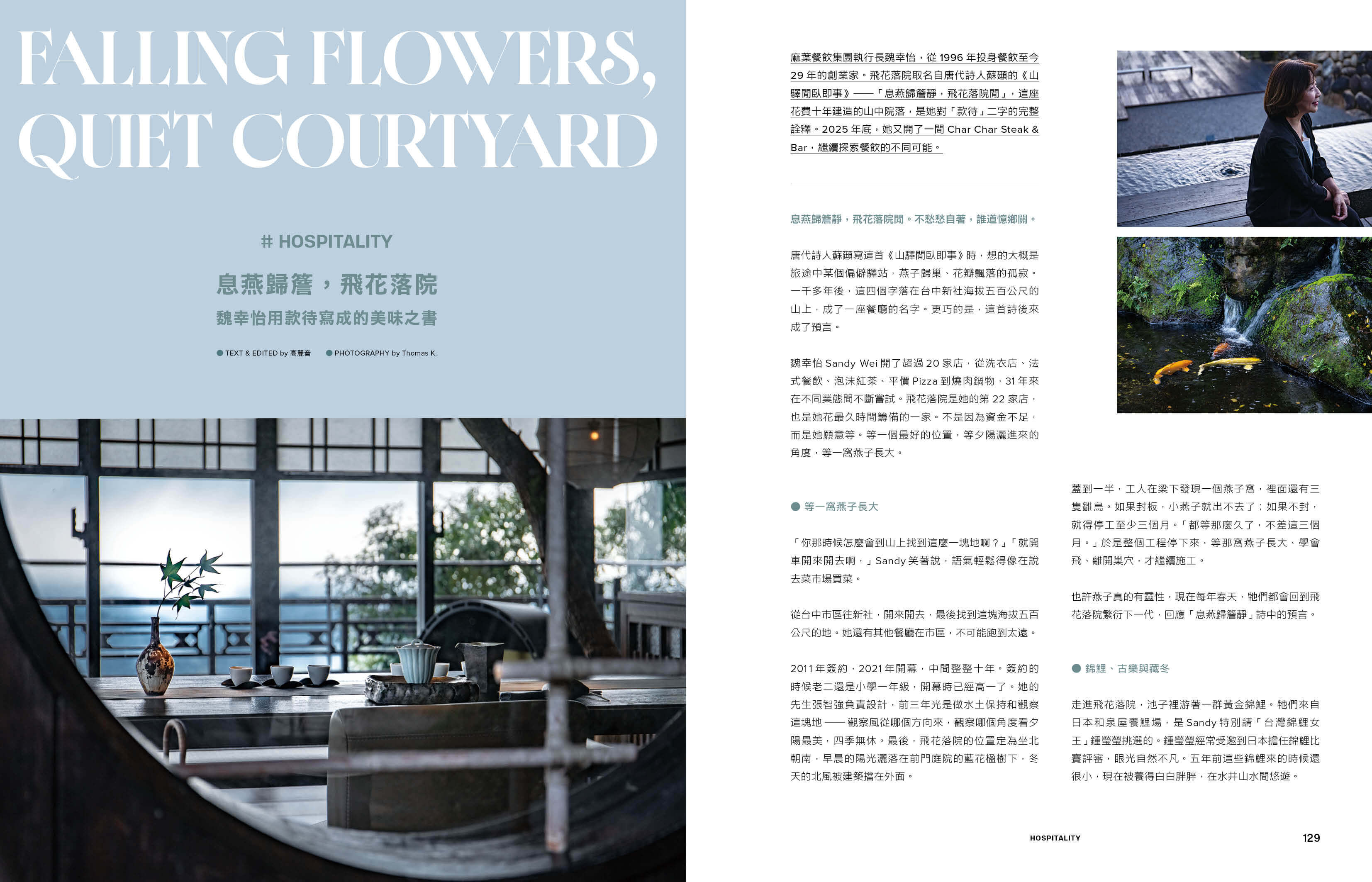 飲食文化方面,歷時十年打造的台中飛花落院餐廳,近年來以空間美學與料理精神,重新定義了台灣高端餐飲的體驗方式。創辦人魏幸怡上個月更開啟全新餐廳,結合牛排、燒烤,並與亞洲50大酒吧Bar Mood合作,展現台中餐飲持續進化的企圖心。