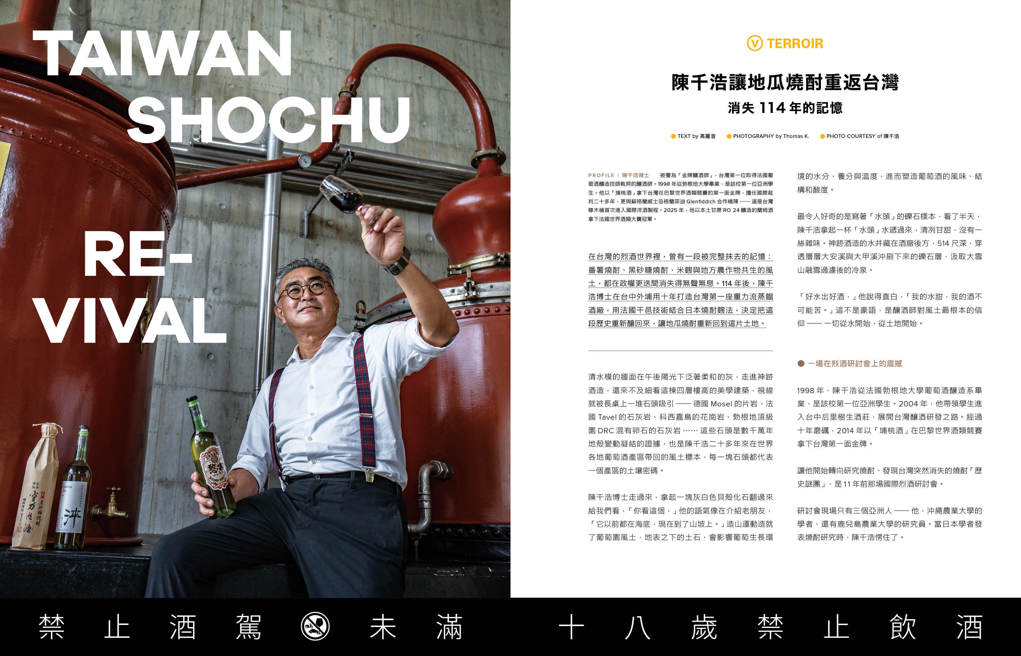 另一個同樣動人的故事,來自台灣烈酒文化中一段曾被完整抹去的記憶:番薯燒酎、黑砂糖燒酎、米麴與地方農作物共生的風土,都在戰後逐漸消失。這兩年,陳千浩博士在台中外埔,以十年時間打造台灣第一座重力流蒸餾酒廠,結合法國干邑技術與日本燒酎麴法,讓地瓜燒酎重新回到這片土地,把被遺忘的歷史重新釀回來。