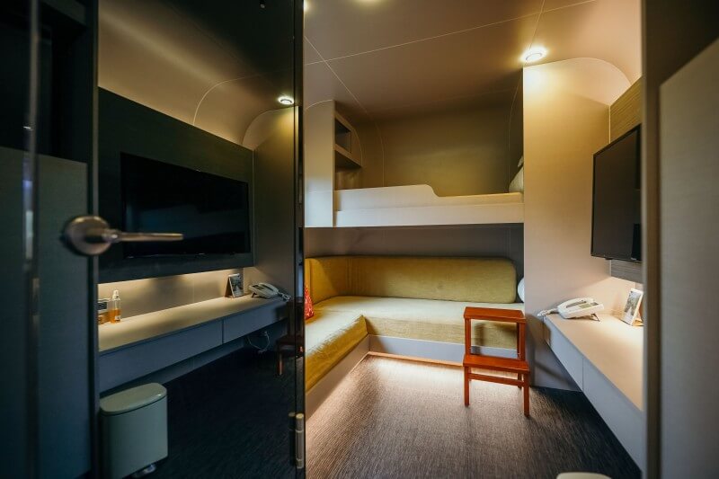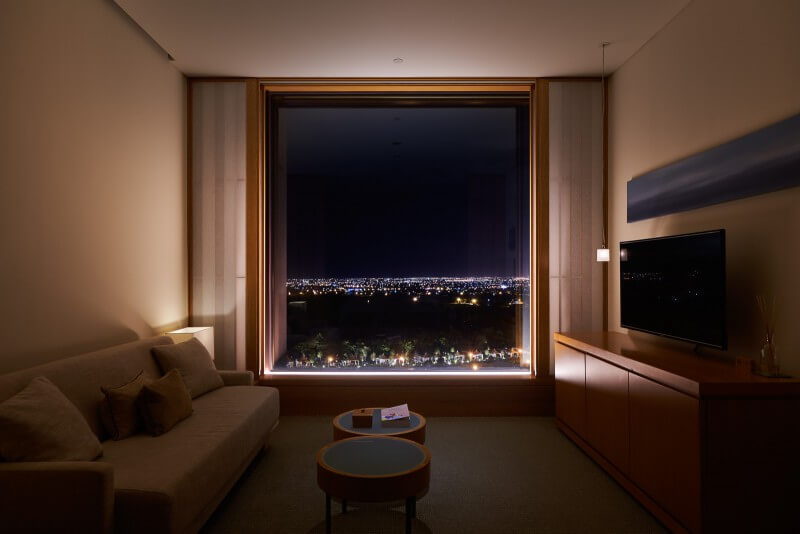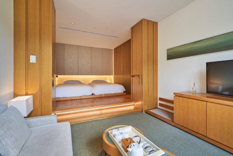 12坪大的空間,有一大床與二中床供選擇。進入客房的地面走道為引進日式稻草漆之漆刷技術,呈現出儉樸且自然的感覺。從玄關進入後,迎面而來映入眼簾的是直接穿透至室外的景觀;浴室使用玻璃隔屏及浴槽旁透明玻璃,展現視覺無阻的營造感。開放式的小客廳與臥室,無論家人情侶或好友同享,都能有足夠寬敞的舒適空間。