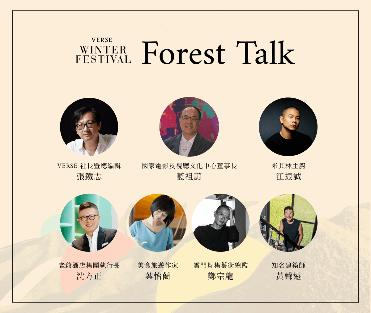 行程首日,是以天為幕的森林論壇。論壇場域周圍是景致清幽的五峰旗山林,遠眺是蘭陽平原及太平洋,《VERSE》集結台灣最具魅力與洞見的文化創造者和產業先行者──台灣在國際上最知名的主廚江振誠、國家電影及視聽文化中心董事長藍祖蔚、威尼斯建築雙年展參展建築師黃聲遠、雲門舞集新任藝術總監鄭宗龍、知名飲食旅遊作家葉怡蘭、老爺酒店集團執行長沈方正與VERSE創辦人、社長暨總編輯張鐵志。