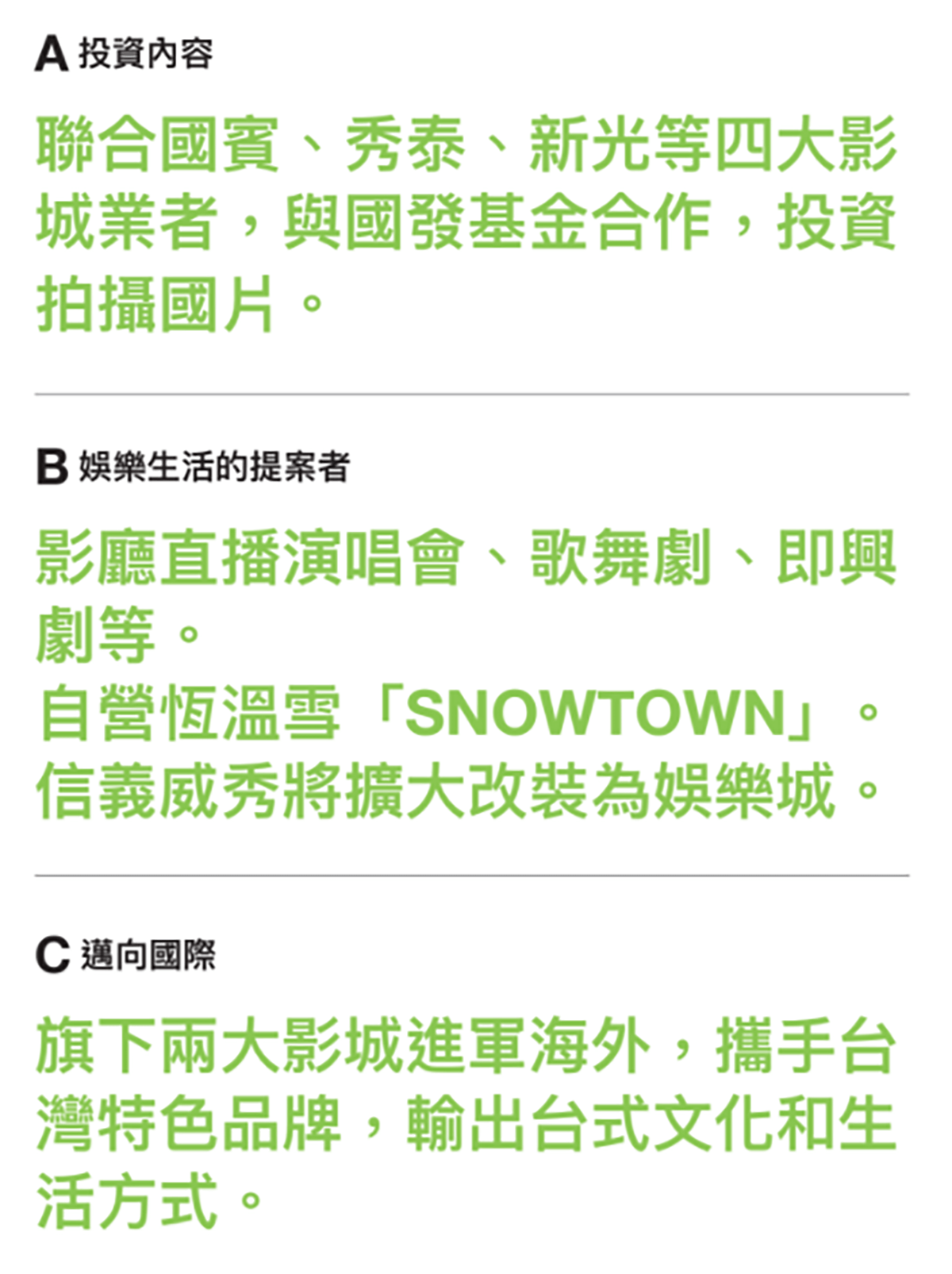 劇本二,旗下兩大影城品牌進軍國際,輸出台灣文化。MUVIE CINEMA鎖定全球大都會拓點;較平價的威秀影城,則往新南向國家發展。