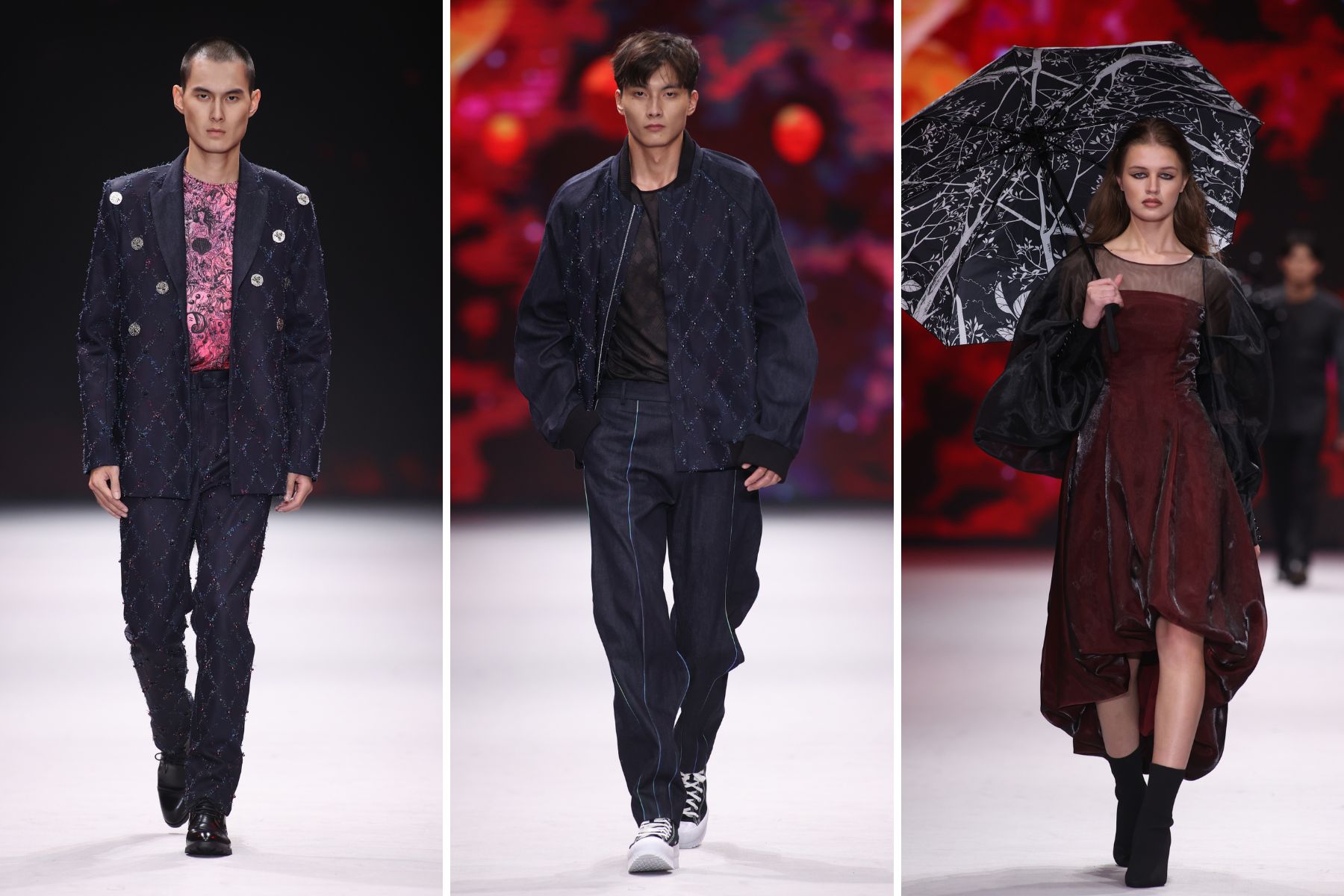 《聰明鎮》演員群(由左至右:潘鋼大、鄭煒齡、余杰恩)受邀擔任本季大秀模特兒。