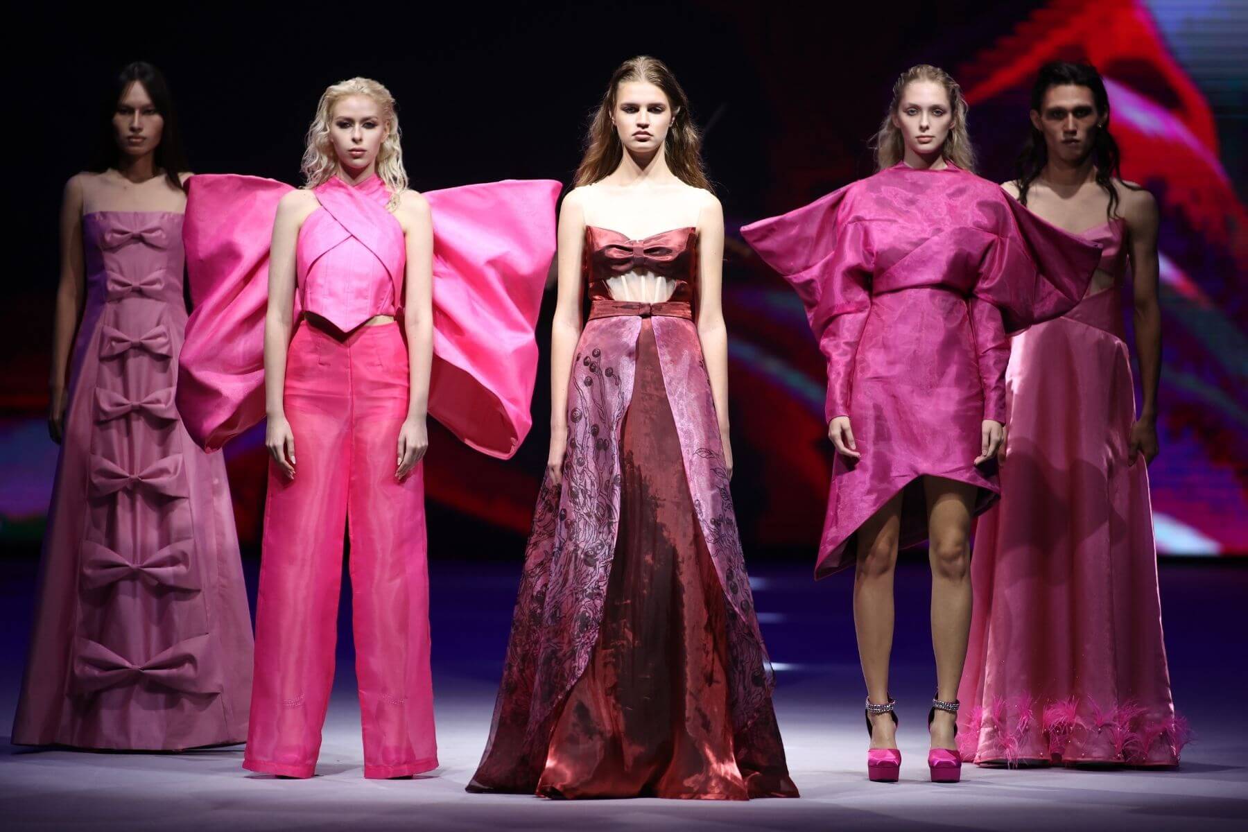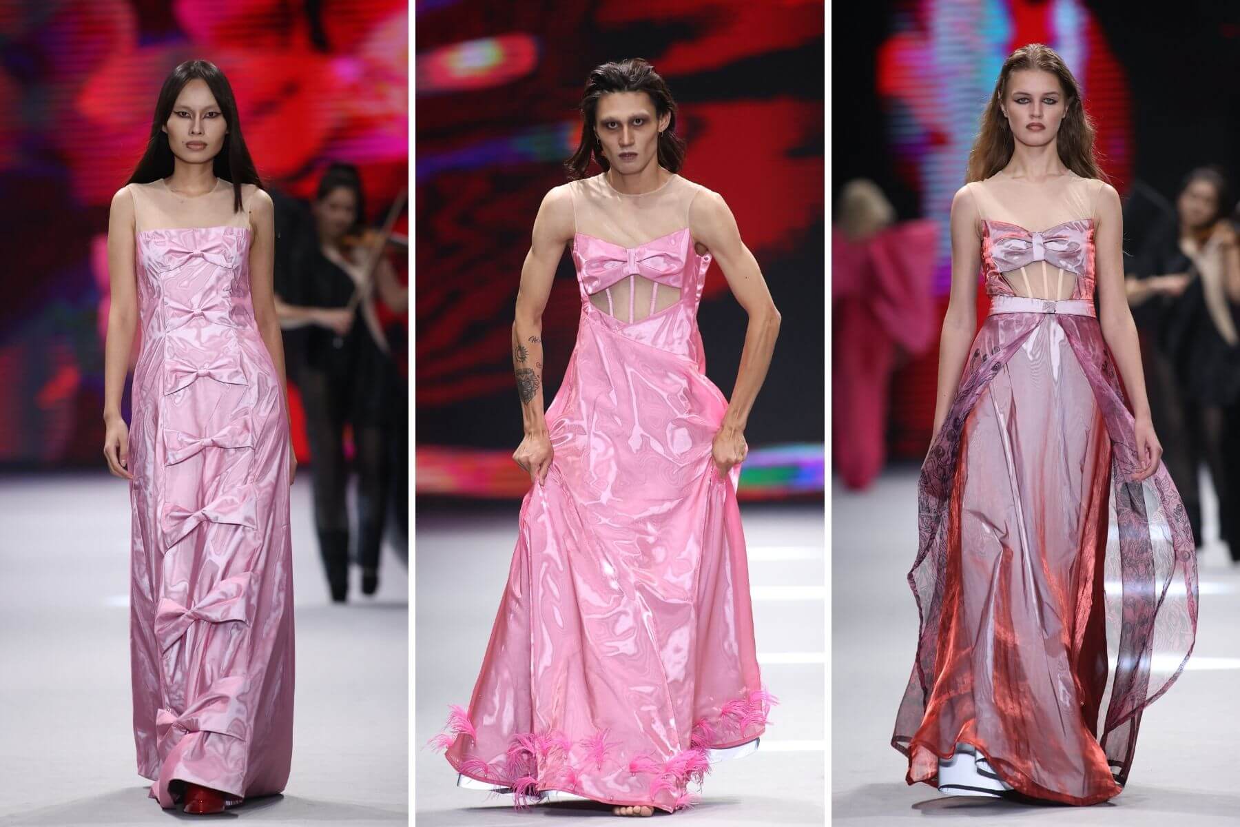 大秀以伊藤潤二經典作品《時裝模特兒》為靈感揭開序幕,看似亮麗的芭比粉色,透過外界閃光燈的照耀直射則會瞬間變色,這是品牌最廣為人知的招牌風格,應用具有光感變色效果的科技面料創造視覺上的震撼與趣味,色澤的改變也象徵每個人皆有所保留的隱藏人格與秘密。