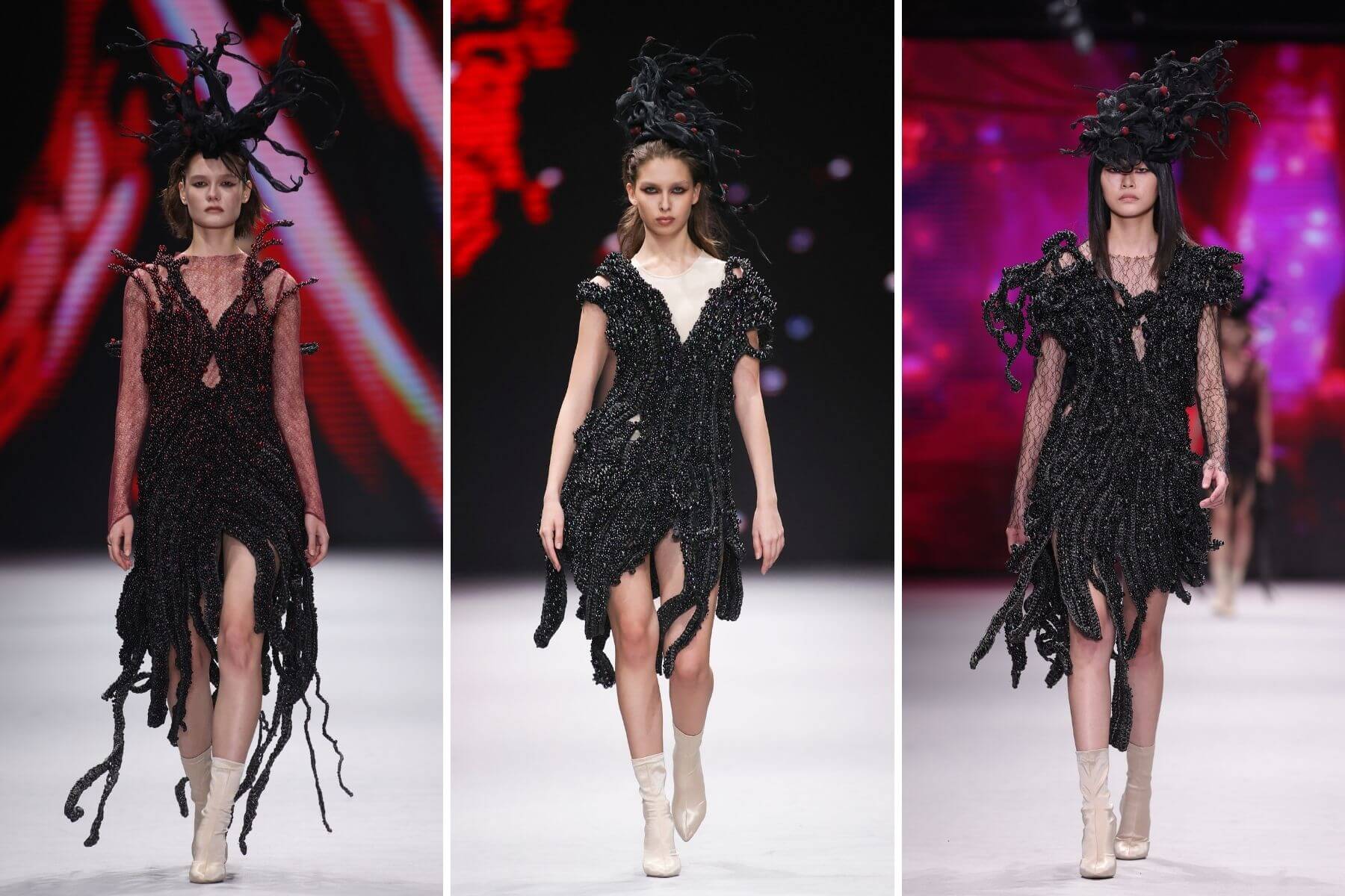 時裝秀以「伊藤芭比」系列開場,模特兒妝容造型致敬伊藤潤二筆下經典角色——《時裝模特兒》的「淵」。