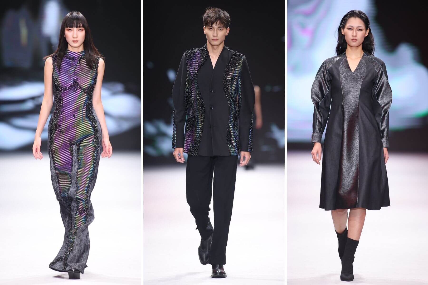 表現油彩虹光的科技面料一直是汪俐伶行之有年的代表元素,學生時期以「未來材質」(Textile Futures)為創作主題的她,多年來致力於科技材質的研究與鑽研,擅長以前衛素材與異材質詮釋東方哲學。