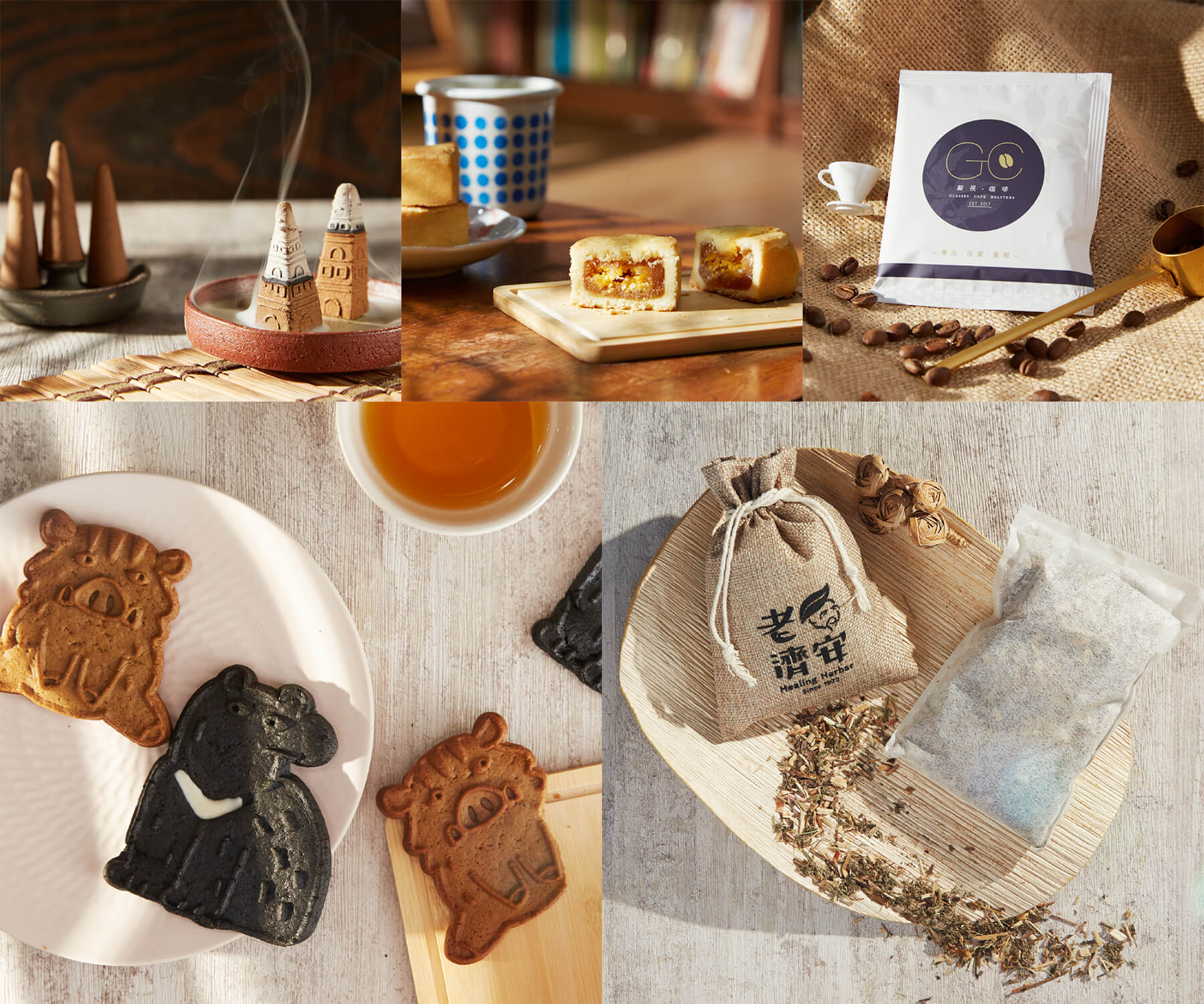 「除了希望萬華的老東西能被保留下來,我們也發現,許多年輕人選擇在萬華落腳,甚至在此展開他們的新事業,所以我們希望在禮盒當中,讓老的、新的事物能互相交融在一起。」陳昱築說道。老明玉香舖的香塔、老濟安的療癒青草包、阿寶師的鳳凰酥、布田的花生酥糖、日常野草的茶包、菓實日的動物造型餅乾以及呆待與凝視咖啡的濾掛包,八樣選品飄逸著歷史傳承與年輕創新交融的氣味。