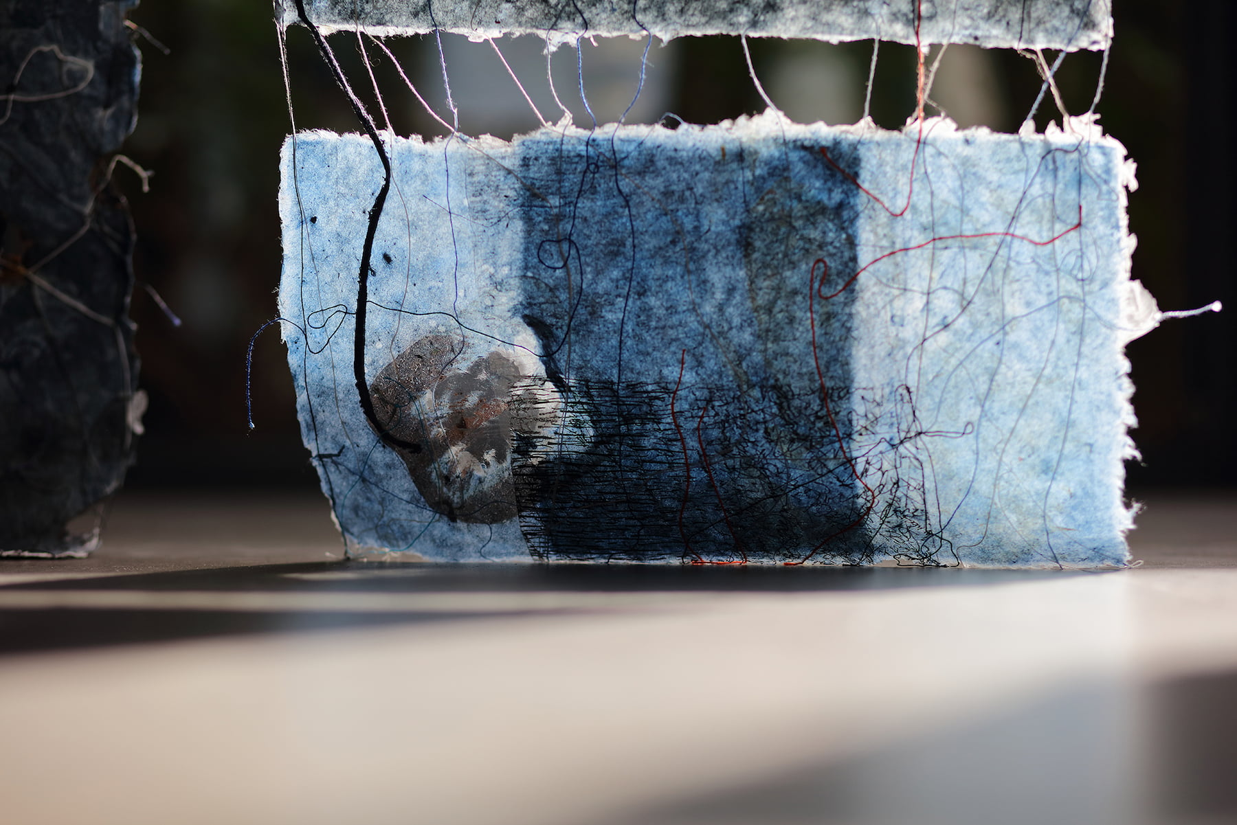 兩人的創作合作啟於2021年,這次特別邀請兩人於台灣首次聯手展出裝置作品〈在深水之中–我們同舟共濟〉,這是一組共36幅的大型垂吊長條紙纖維裝置,構想來自於兩人在加州生活時,觀察氣候變遷對人們帶來的生命感受。