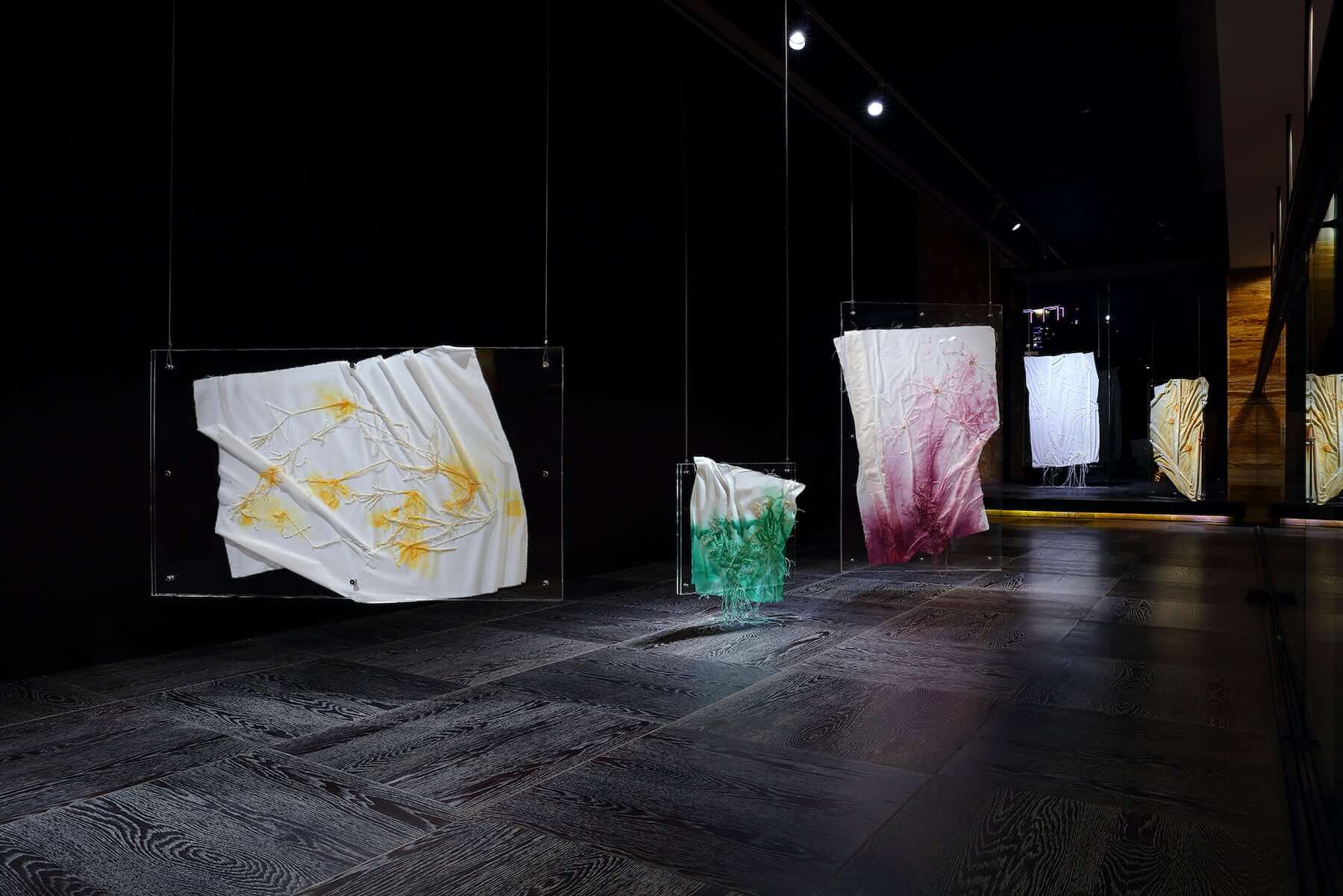 陳聖文長期關注環境議題,過去的作品總是夾雜撿拾的異材質凸顯自然與人造物之間的無聲對話,此次〈人造免疫〉的纖維創作,靈感來自台中老家旁的旱溪,述說整治工程帶動水文的流動及變遷。其以溪水作為異材質,添加的染料暈染在纖維布料上,體現污染造成的水體變色。作品安置在二樓走道的空間,呈現色彩及材料之間的來回變化。回溯在現代化的發展下,那些不可逆的破壞只是肉眼雖看不見,但依舊存在。