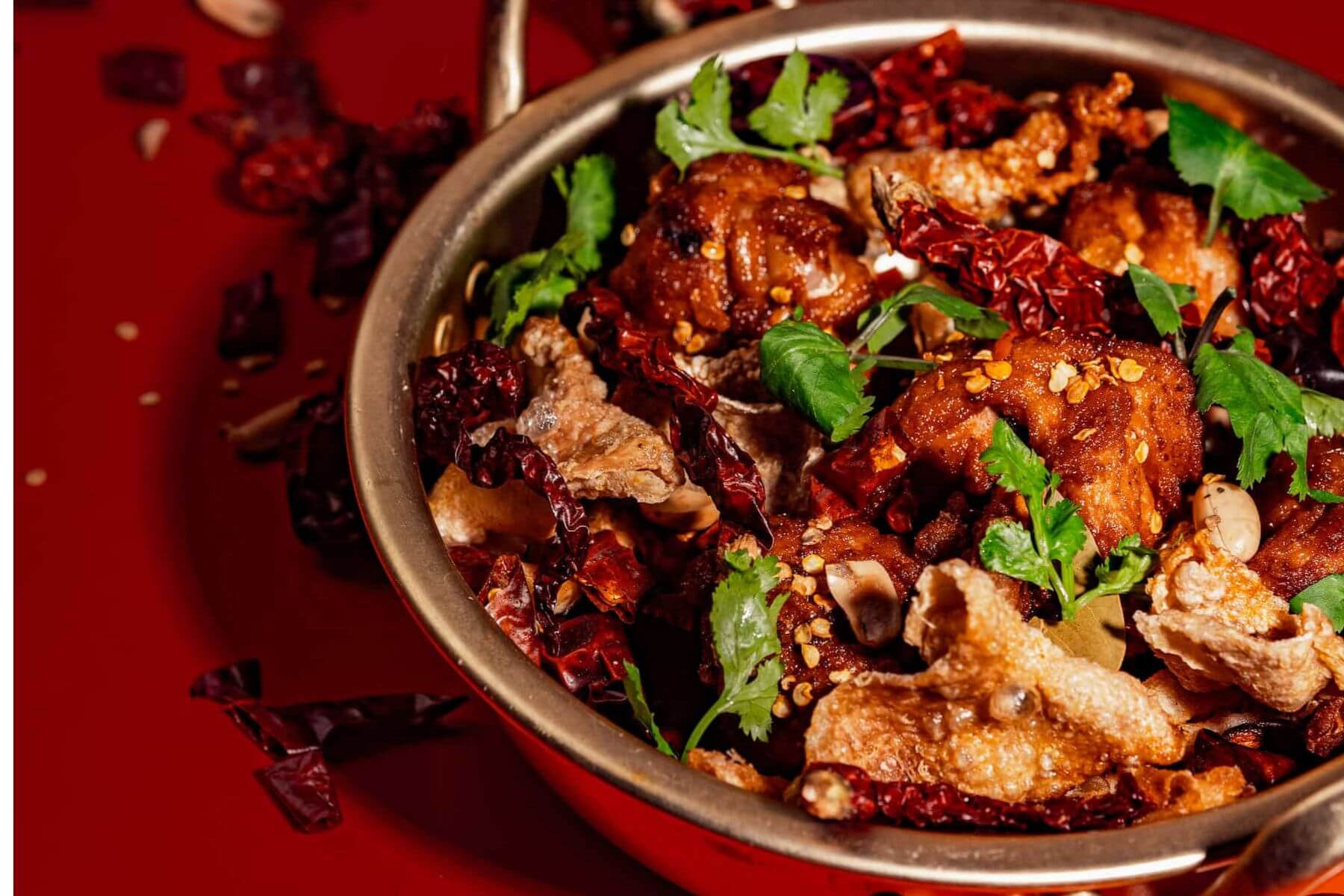 「麻辣鍋炸雞 HOT-POT CHICKEN」以台灣人最愛的麻辣火鍋為本味,將削骨棒腿以麻辣鍋底醃漬入味,酥炸雞皮、大紅袍、二荊條、宮寶椒、青花椒混合,最後淋上招牌香辣紅油,是週末炸雞俱樂部最賣座的炸雞。