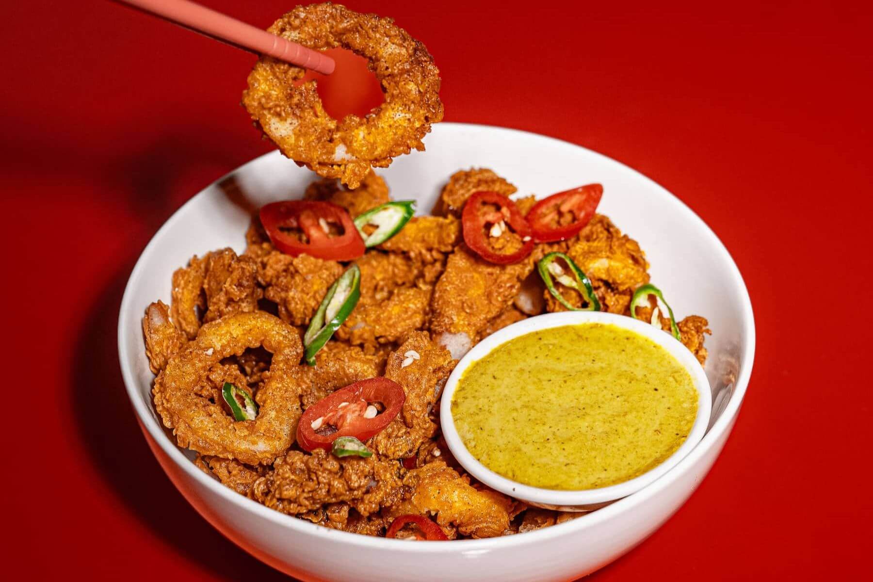 「青龍魷魚圈 GREEN DRAGON CALAMARI」鹽酥雞攤必點的炸魷魚,在週末炸雞俱樂部搖身一變,成為最佳下酒菜;蘸上酸甜微辣的青龍椒醬無比涮嘴。