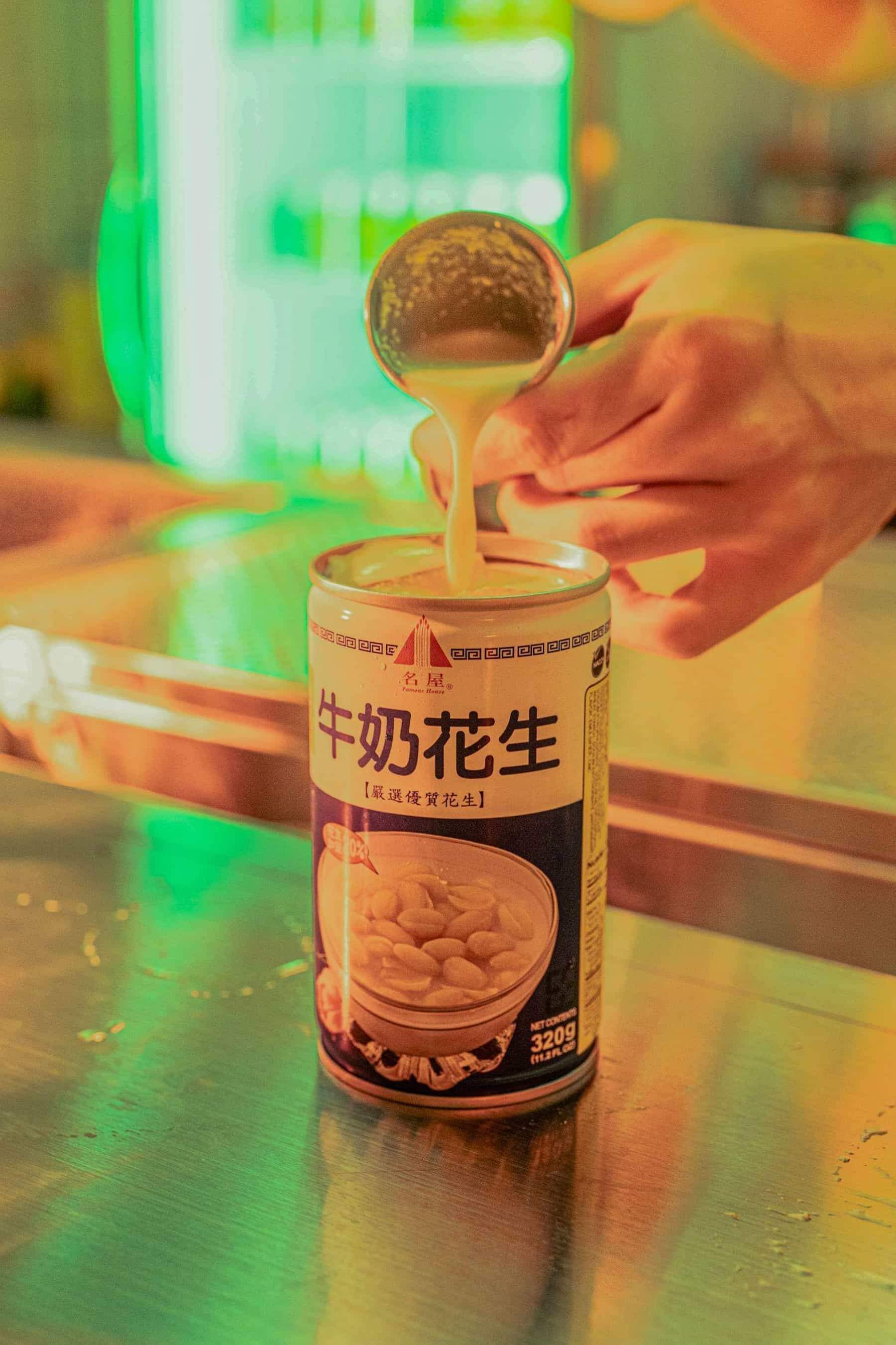 「花生牛奶 PEANUT MILK」將記憶中小時候最愛吃的牛奶花生做成調酒;綿密的花生糊、蘭姆酒與玫瑰水增添古早風味、清酒增添發酵層次,搭配花生糖、牛乳曾為記憶中最深刻的美味調酒。